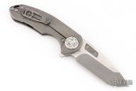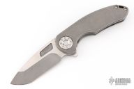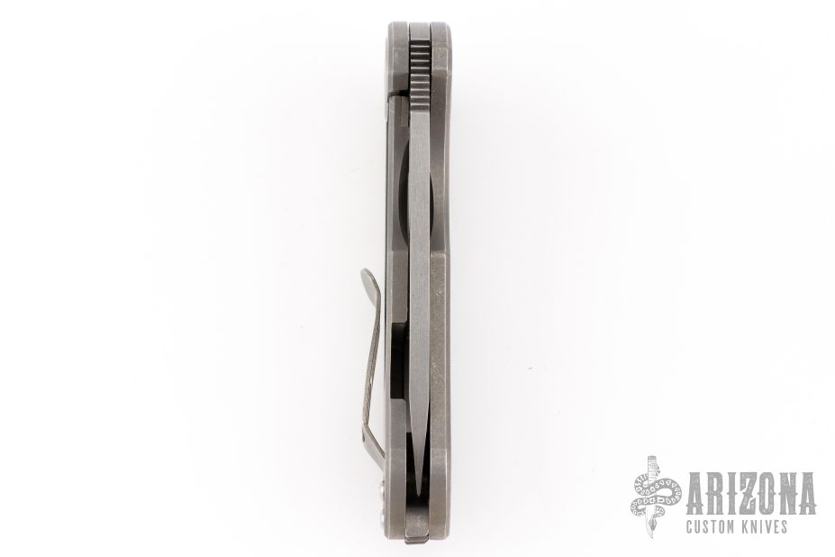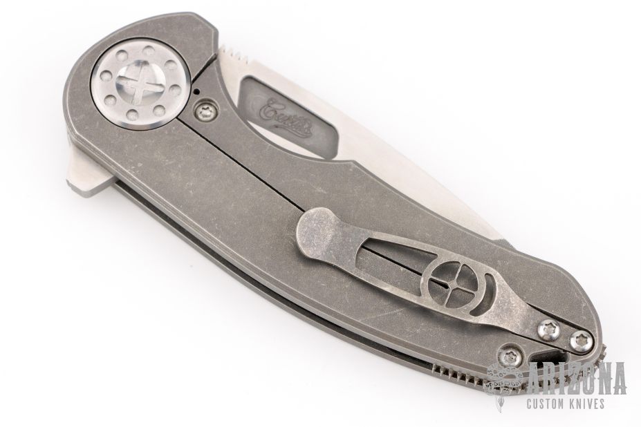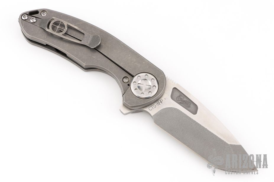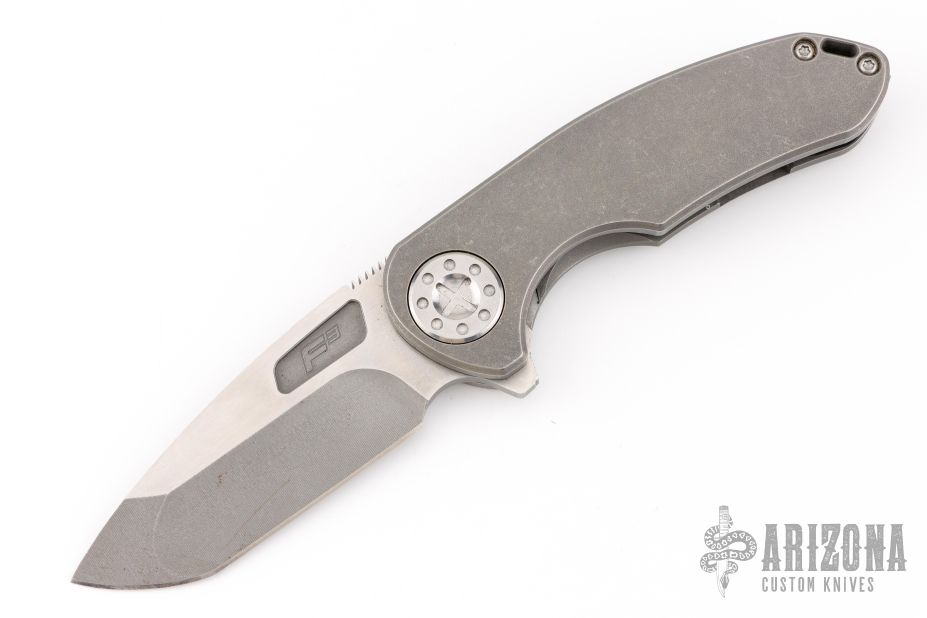 This F3 Medium by Curtiss Knives features a two-tone acid/stonewashed blade with notched thumbrest and flipper. The handle has a tumbled titanium frame with a matching tip up titanium clip. Satin stainless hardware. Rides on bearings, nice detent and lockup.  Comes with original box, zipper case, COA, patch and stickers. Has some scuffs and scratches great condition otherwise.