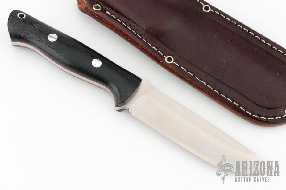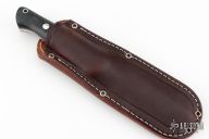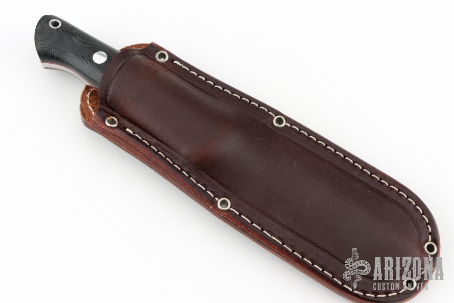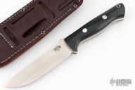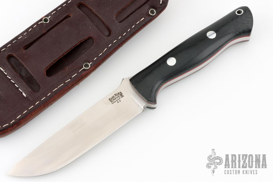 This Bravo-1.25 by Bark River Knives features a satin finished blade with notched thumbrest, .216" blade and 1.365" blade depth, full tang construction. The handle has black canvas micarta scales, red liners, and aluminum pins. Comes with a brown leather sheath and original box. Has a couple light scuffs, great condition otherwise.