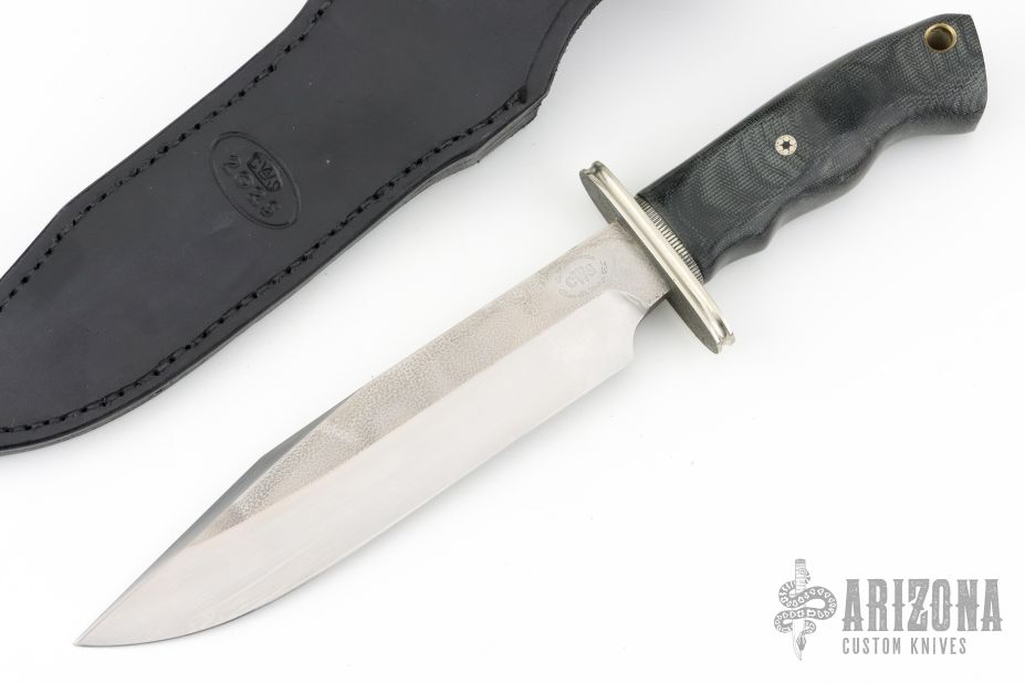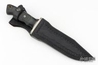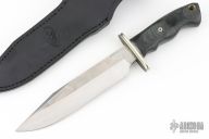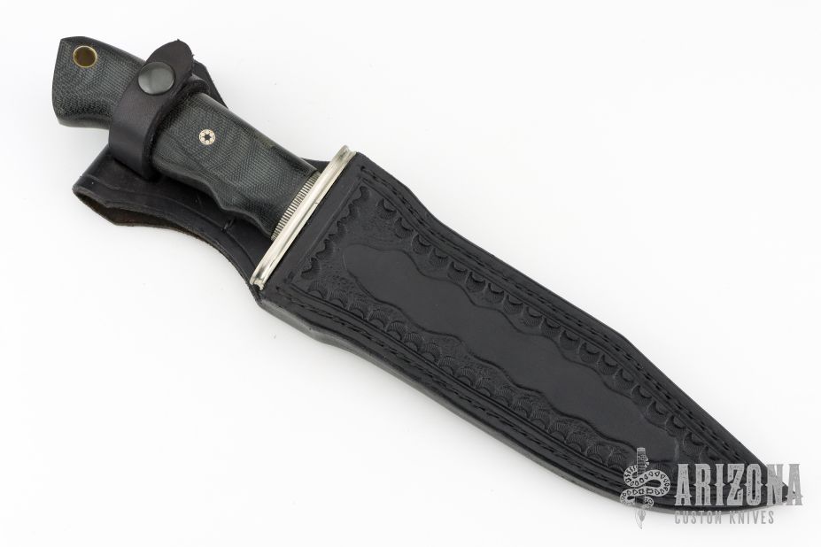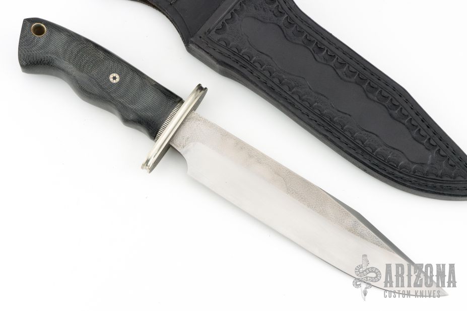 This Fighter by Chuck Schuette features a hand rub satin finished spear point blade with a false top edge and hammer-marked flats, .193" blade stock and 1.575" blade depth, hidden tang construction. The handle has a fluted nickle silver guard, black canvas micarta grip with a coin edged nickel silver spacer and a mosaic pin, lanyard hole at the butt. Comes with a hand tooled black leather sheath. New from maker!