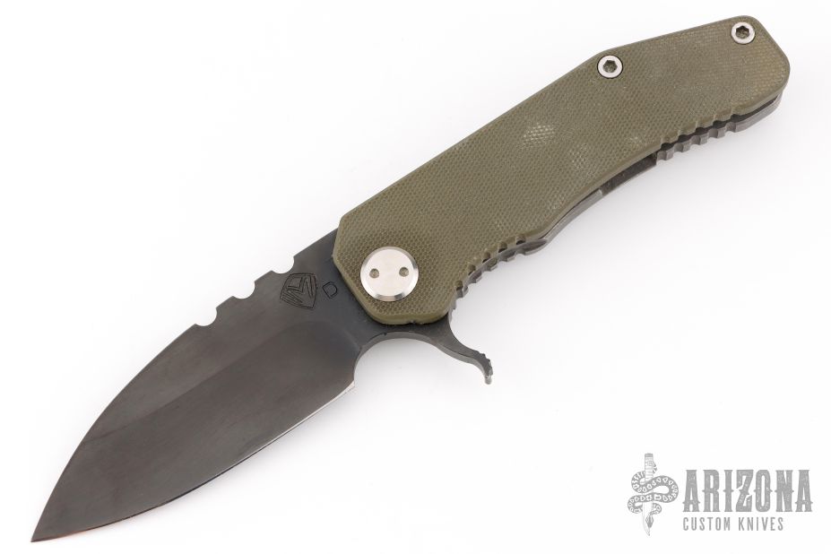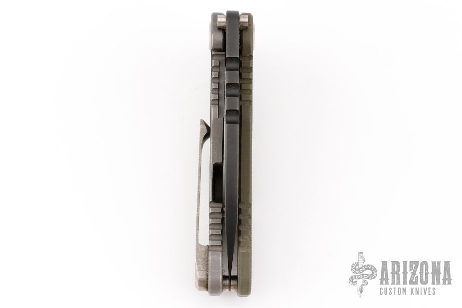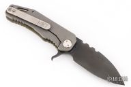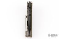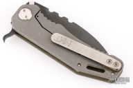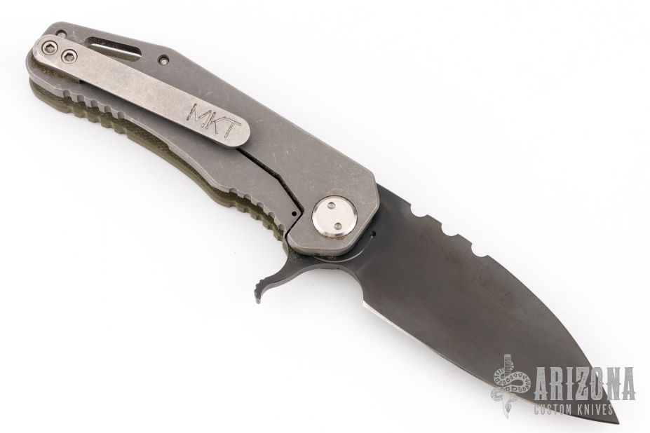 This 187F by Medford Knife and Tool features a gray PVD coated blade with notched thumbrest and flipper. The handle has a tumbled titanium lockside with green G10 scale and tip up titanium clip. Comes with original box and papers.  Nice detent, lockup and blade seating. Has a couple light scuffs and scratches. Great condition otherwise.