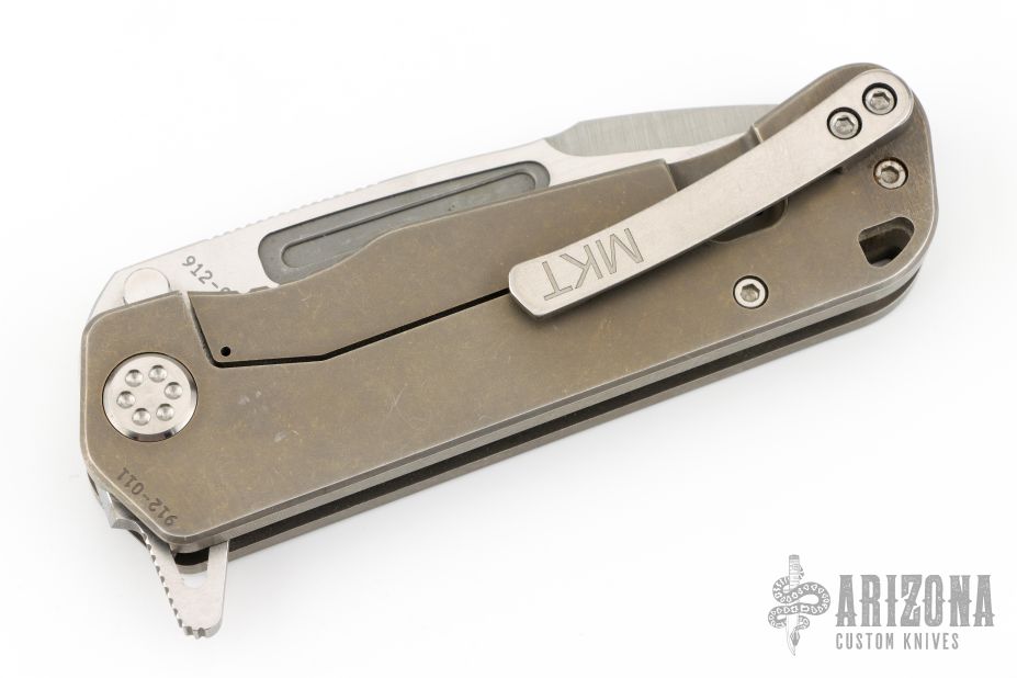This Proxima by Medford Knife and Tool featured a stonewashed spear point blade with fullers and a notched flipper tab. The handle is composed of anodized fade tumbled finished titanium, anodized hardware and tip up pocket clip with a lanyard hole. Includes the original box, hard case and papers. Has some light scratches, great condition otherwise.