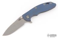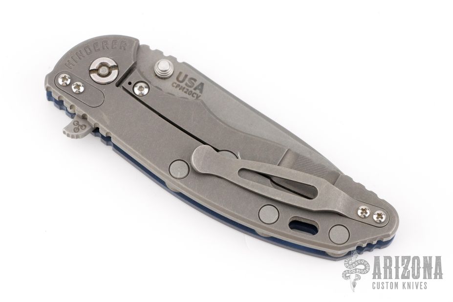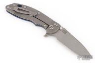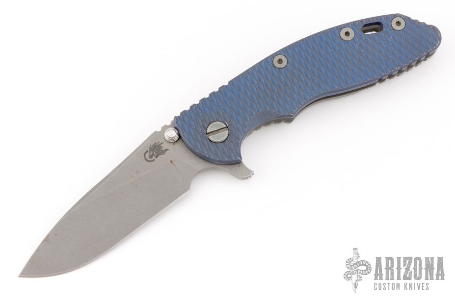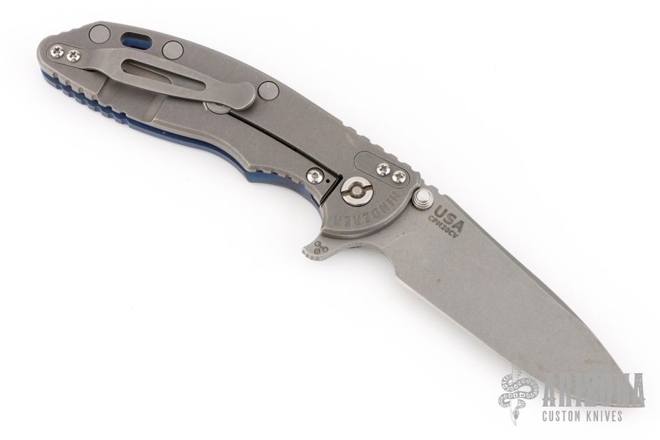 This XM-18 by Rick Hinderer features a working finished blade with notched thumbrest and flipper. The handle has a textured and anodized titanium scale. Framelock with working finished: hardware, posts, pivot, and tip up or down reversible titanium clip. Lanyard hole at the butt.