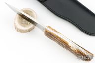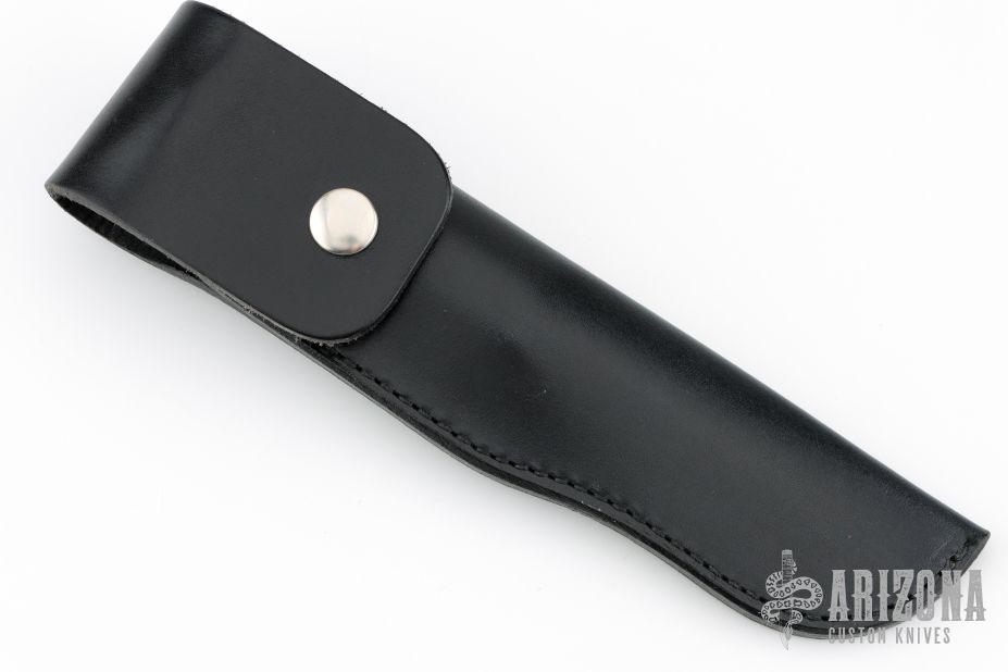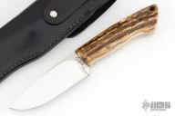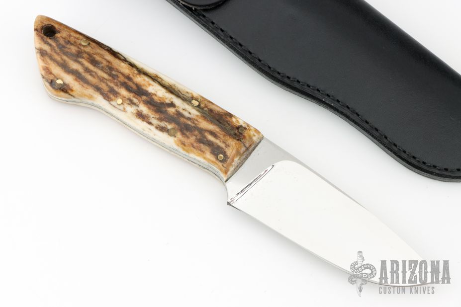 This hunter by Elrod features a mirror finished blade with .165" blade stock and 1.283" blade depth, full tapered tang construction. The handle has stag scales and brass pins. Comes with a black leather sheath. Excellent condition.