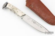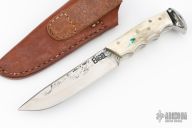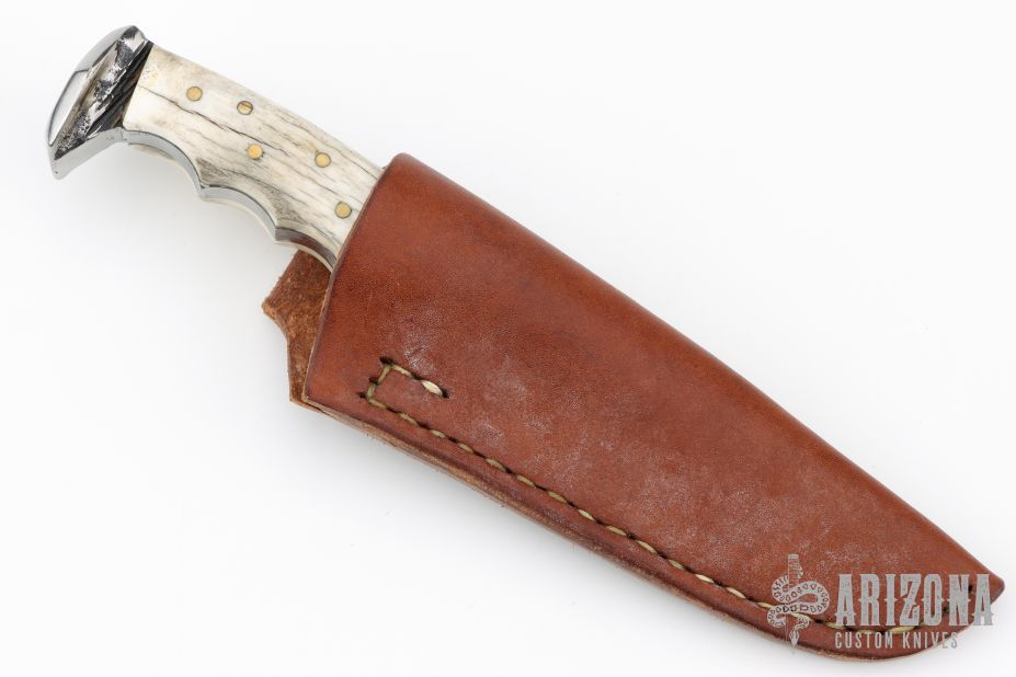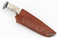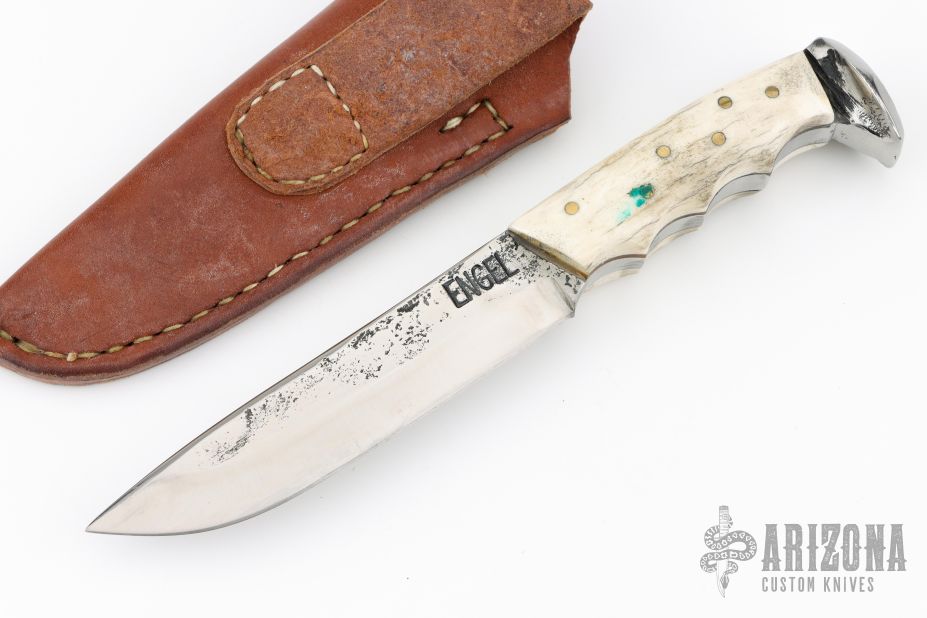 This knife by Engel was forged from a railroad spike. It features a drop point blade with false top edge, .275" blade width, 1.041" blade depth. Pinned bone grip with finger grooves. Comes with brown leather sheath. Has some scratches and patina. Great condition otherwise.