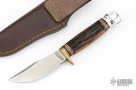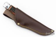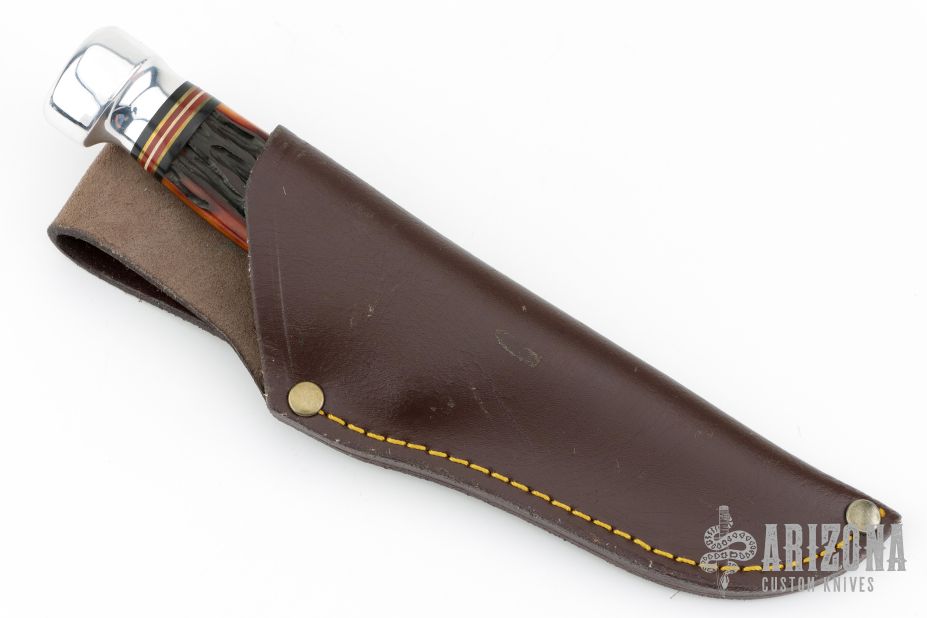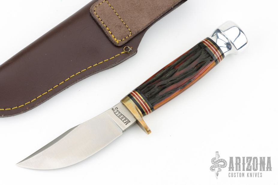 This Woodcraft by Marbles features a satin finished blade, .182" blade stock and 1.074" blade depth, hidden tang construction. The handle has a brass guard with jigged grip and red/white/brass/black spacers and aluminum butt cap. Comes with original brown leather sheath. Has some scuffs and scratches, great condition otherwise.