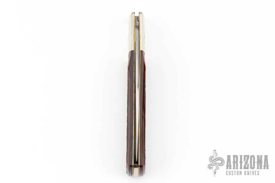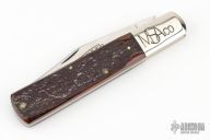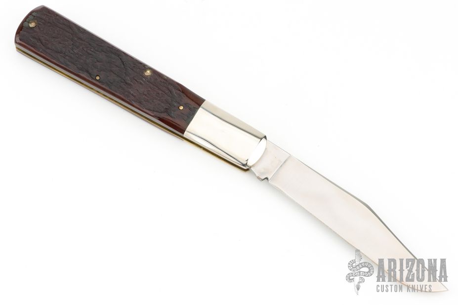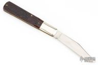 This lockback by Robeson Cutlery for Marbles, features a high satin finished blade with nail nick The handle features nickel silver bolsters and jigged bone covers over brass liners and stainless steel spring. Includes original box. Has a couple light scuffs, otherwise Excellent Condition.