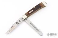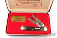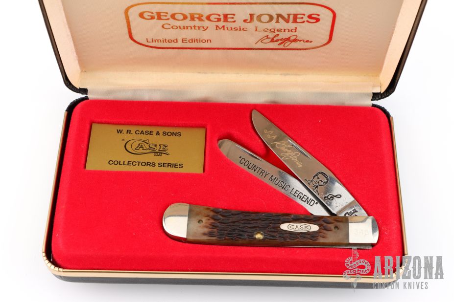 This Trapper by Case features 2 polished blades with nail nicks. The handle has nickel silver bolsters, jigged bone covers, with a Case shield, brass liners and stainless springs. Comes with original box. Excellent condition.  George Jones "Country Music Legend" #346