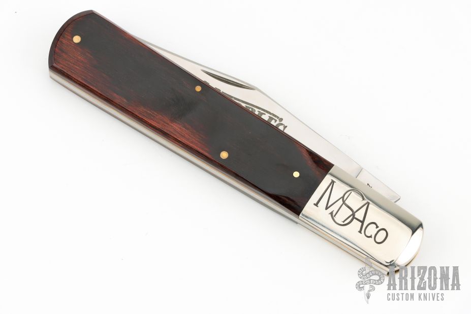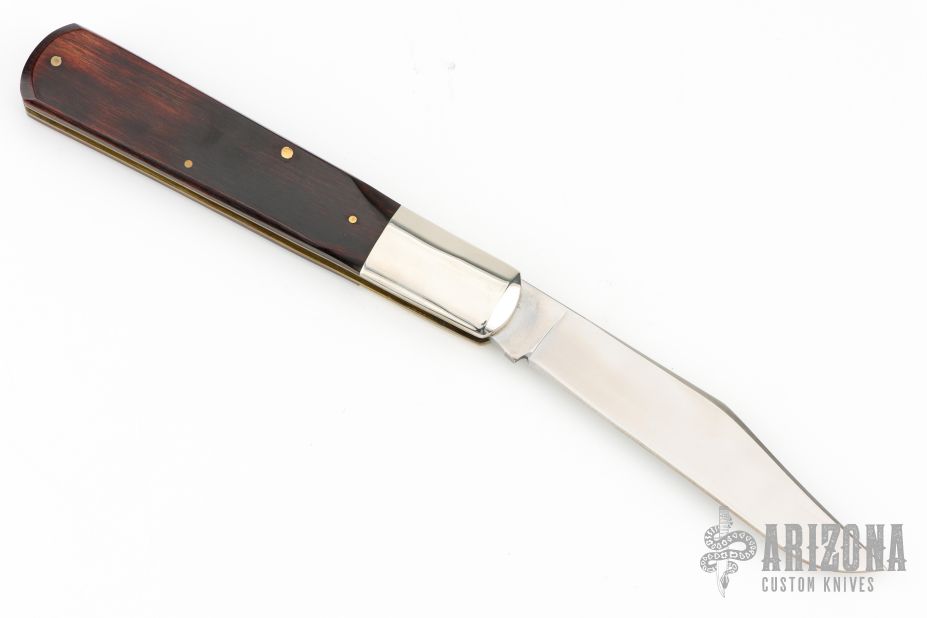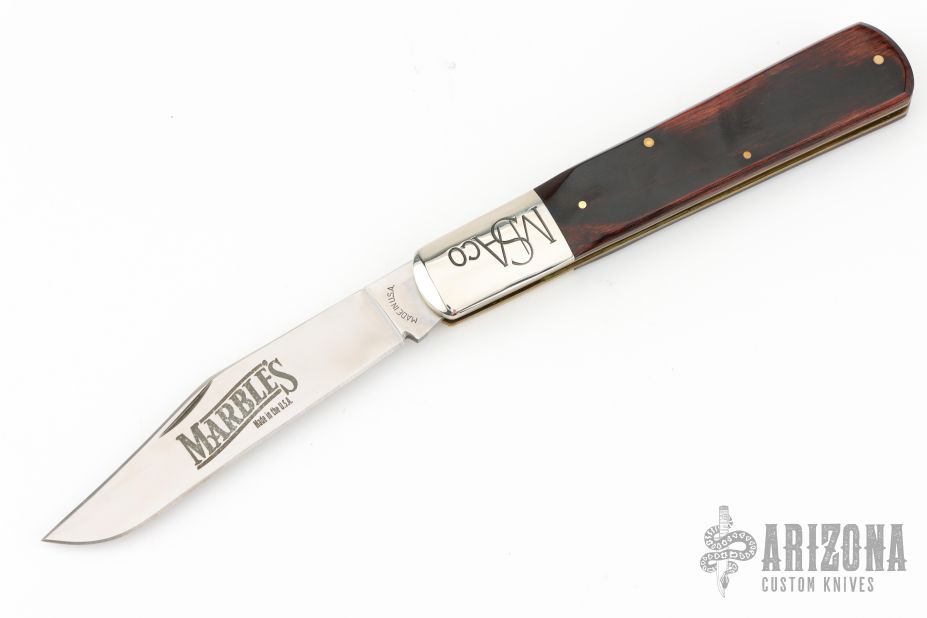 This lockback by Robeson Cutlery for Marbles, features a high satin finished blade with nail nick The handle features nickel silver bolsters and wood covers over brass liners and stainless steel spring. Includes original box. Has a couple light scuffs, otherwise Excellent Condition.