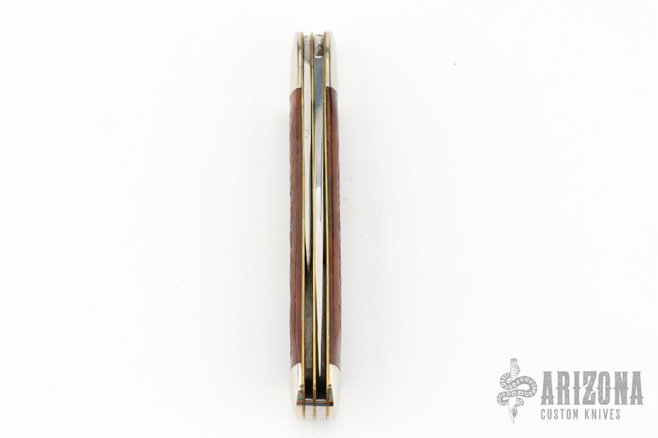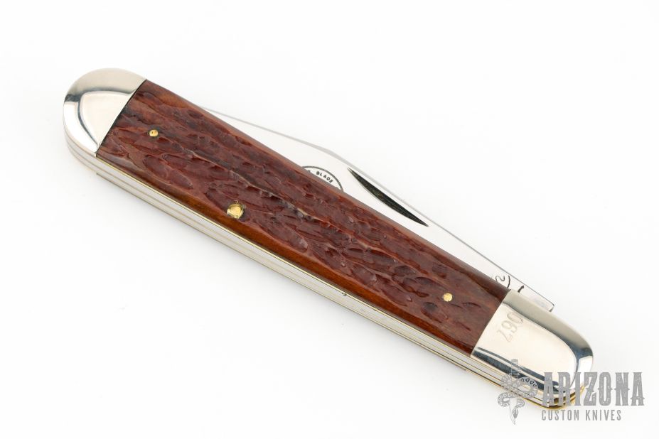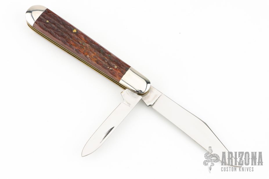 This slipjoint by queen cutlery co features two mirror finished blades with nail nicks.  The handle features nickel silver bolsters, brass liners and jigged bone covers. Steel spring. Comes with original box. Has light scratches, otherwise excellent condition.