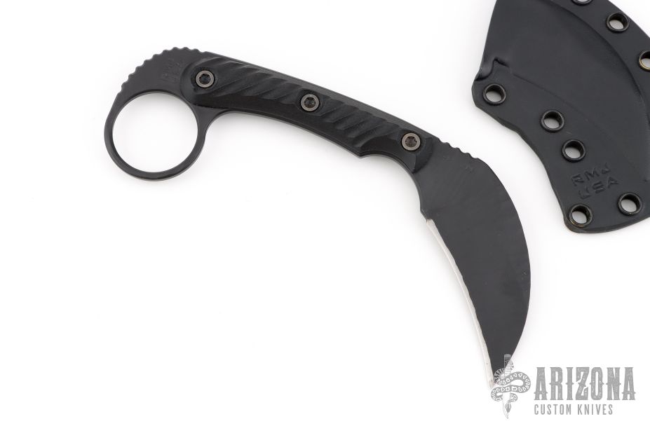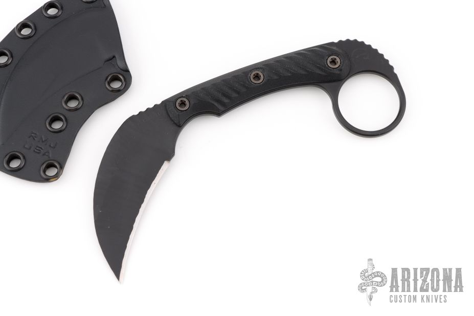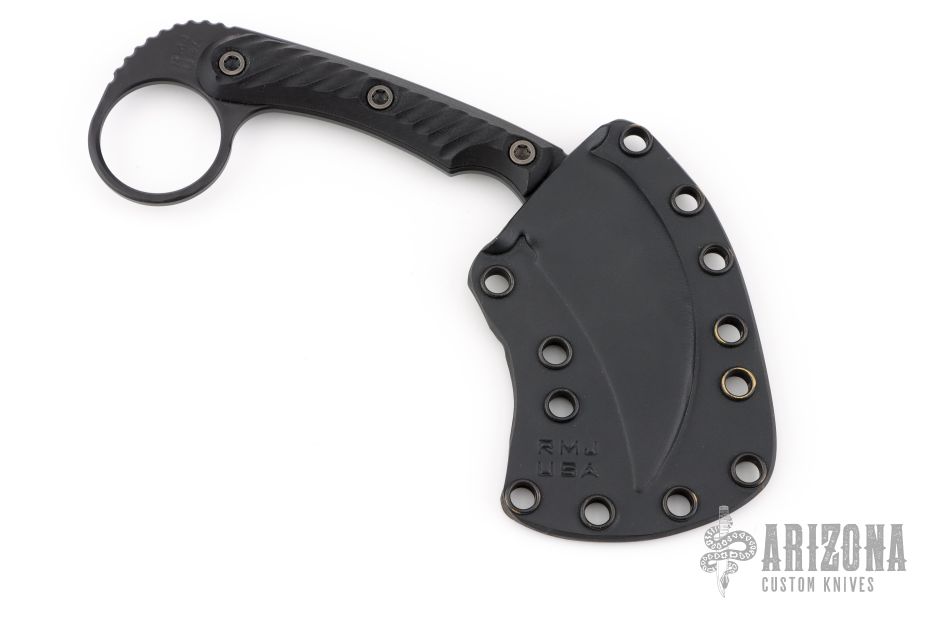 The Korbin is an easy to conceal defensive fixed blade knife. Karambit style knives like the Korbin are great back up blades for those that carry a handgun daily. They are lightweight, deploy quickly and haveno moving parts to fail. They are gross motor skill tools as well, meaning no special skill is required for effective use. The aggressively shaped talon blade on the Korbin is made from Nitro-V stainless steel and features a Tungsten Cerakote finish for wear and glare resistance. The Korbin is designed to work in both reverse and standard grips, and the 1 1/8" finger hole is large enough to fit most finger sizes. The Korbin comes with a molded kydex sheath that includes a two-way belt adapter allowing ambidextrous, vertical and horizontal carry options. The sheath is also compatible with our optional MAD Straps if you would like to carry IWB (Inside Waist Band). You can find the optional MAD Straps on RMJ's website.