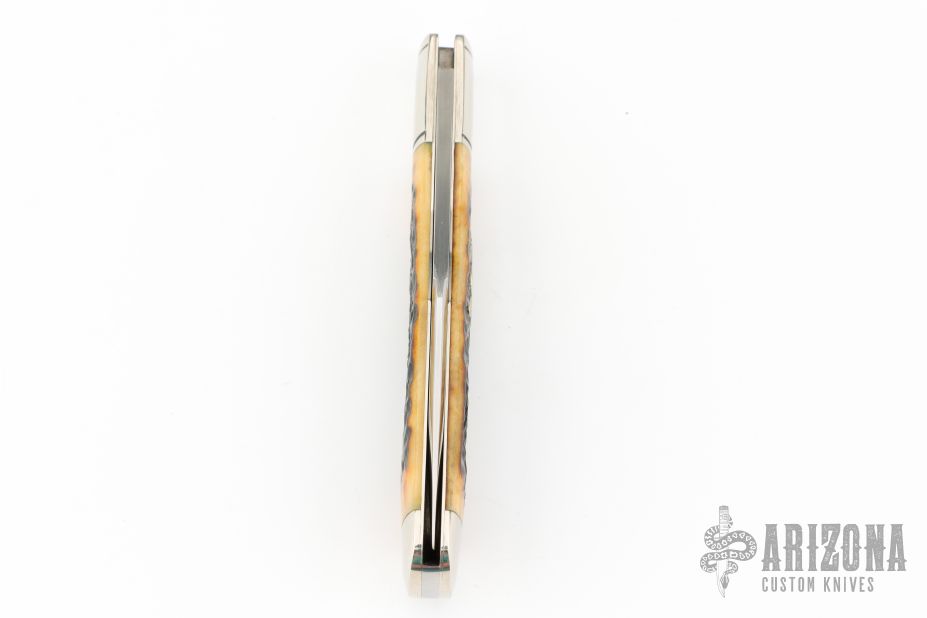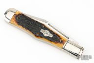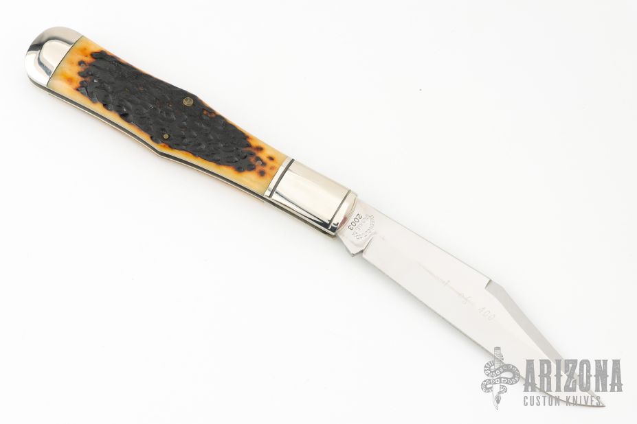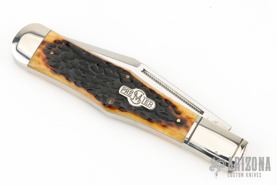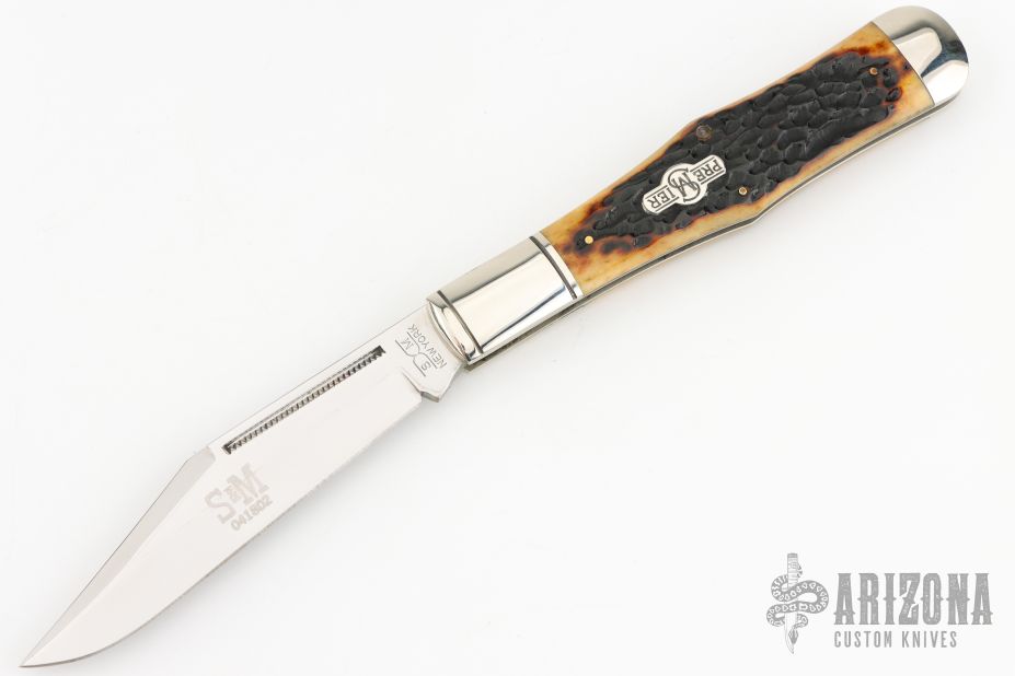 This Coke Bottle by Schatt & Morgan features a satin finished blade with long pull. The handle has nickel silver bolsters, pick bone covers, brass liners and stainless steel spring. Excellent condition. Comes with original box and paper.