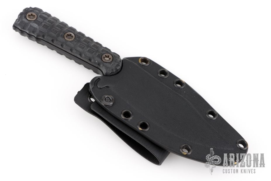 The UCAP is a mid-sized fixed blade that is geared for everyday carry. The knife was created with a defensive purpose in mind, but is also well equipped for any and all cutting chores where a knife is called for, from first responder situations, outdoors activities, and just about anything else you can throw at it. It's a looker too, look at those classic lines and that belly! The UCAP has a bowie-style clip point blade made from S45VN steel. The knife features a 4" blade that has a tungsten cerakote finish for corrosion resistance and durability. Weighing in at 5.2 oz, the knife is deceptively light, yet can hold its own in both categories of everyday carry as well as heavy use tactical knife. Offering a full tang and tubed rivet handle construction, this is one tough little knife! The beveled and contoured G10 grips feature a diagonal texturing that offers a very secure grip without being overly aggressive and they work very well wet or dry. Has some scuffs, otherwise excellent condition. Comes with original sheath.
