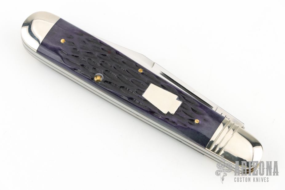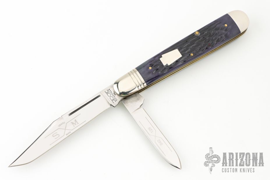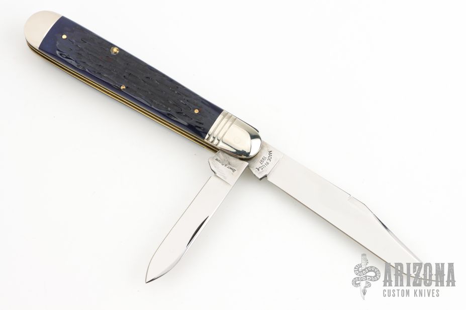 This knife by Schatt & Morgan features 2 mirror polished blades with nail nicks. The handle has nickel silver bolsters, brass liners, jigged bone covers and stainless springs.  Includes the original box and paper. Has a couple light scratches, Excellent Condition.