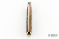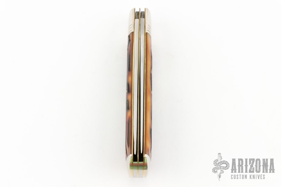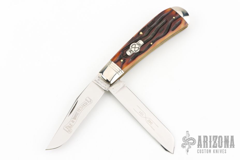This slipjoint by Schatt and Morgan features two polished blades all with nail nicks.  The handle features nickle silver bolsters, brass liners and bone covers. Stainless steel springs. Has a few light scratches, otherwise excellent condition.  Comes with original box.