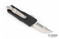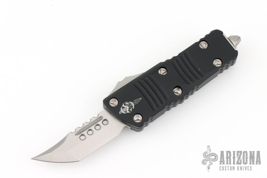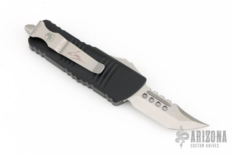 This Signature Series Troodon Mini Hellhound OTF automatic by Microtech knives features a stonewash finished single edged blade, and a black aluminum handle with bead blasted hardware, tip down carry. Glass breaker. S/N 210. Dated 12/2022. Comes with original box and papers. Excellent condition.