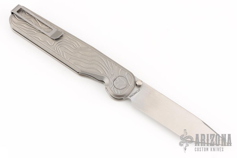 The Rockwall by Tactile Knife features a stonewashed Magnacut Tanto blade with notched thumbrest and dual thumbstuds. The handle has a Topo milled titanium frame with a tip up stainless steel clip and backspacer. Comes with original box and papers dated 02/19/24. Excellent condition.