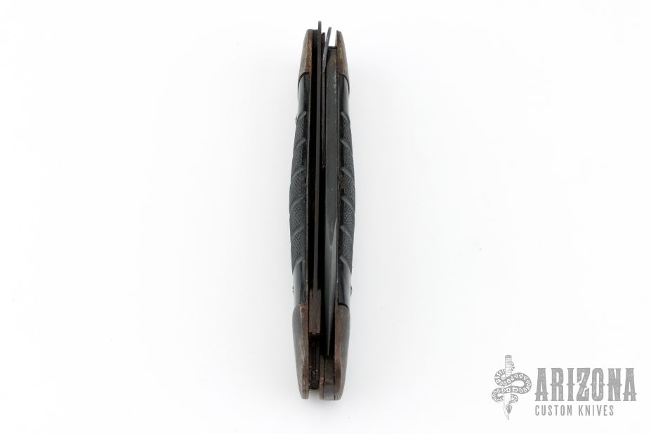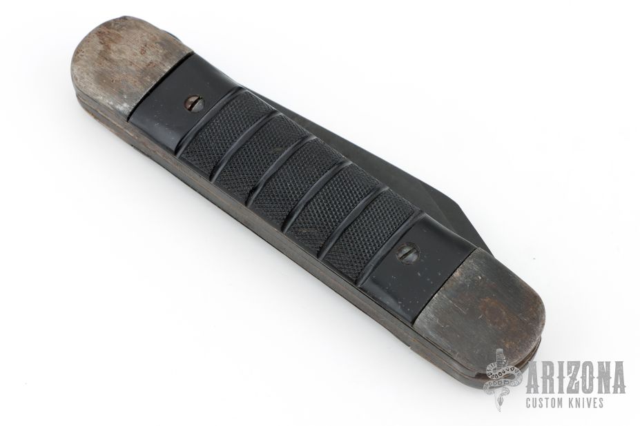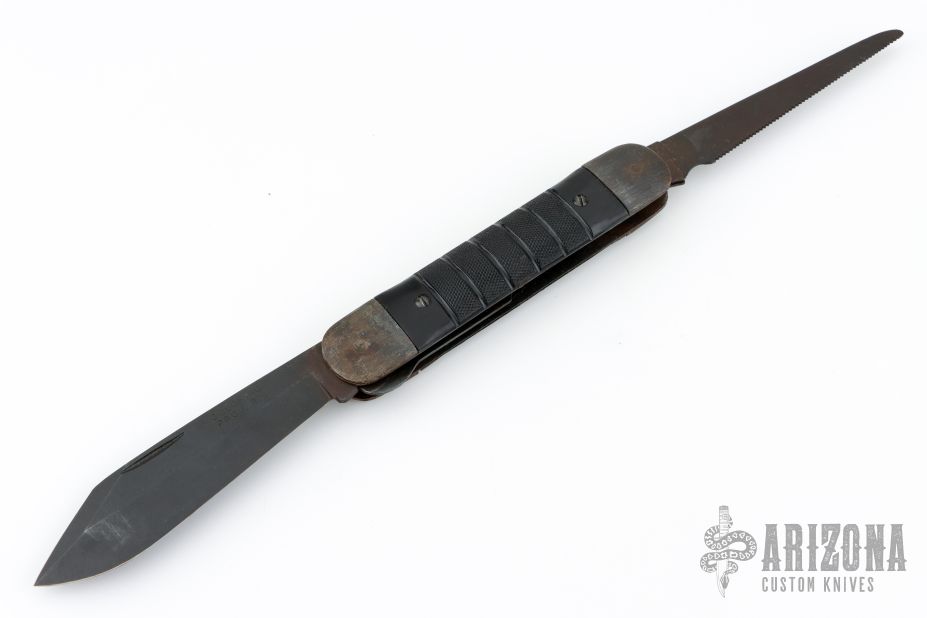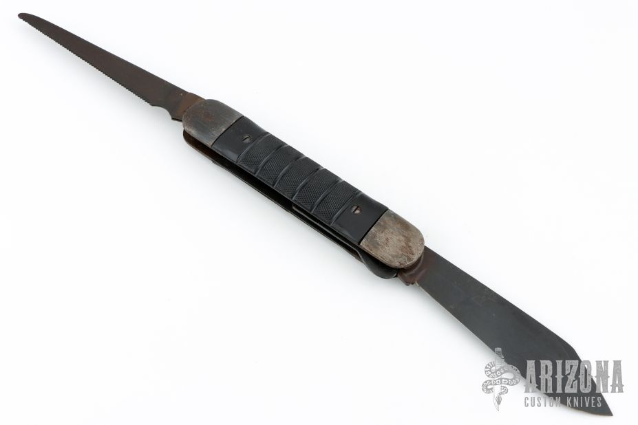 This folder by Colonial Knife Company features a clip point blade with nail nick, and a folding saw blade as well. The handle has steel bolsters, black scales, steel liners and springs. Has some scuffs, scratches, and some light rusting. Comes in a box. Great condition for its age, good condition otherwise.
