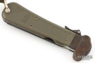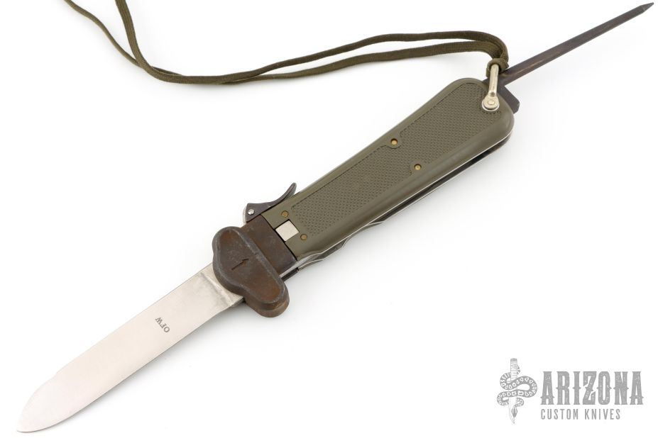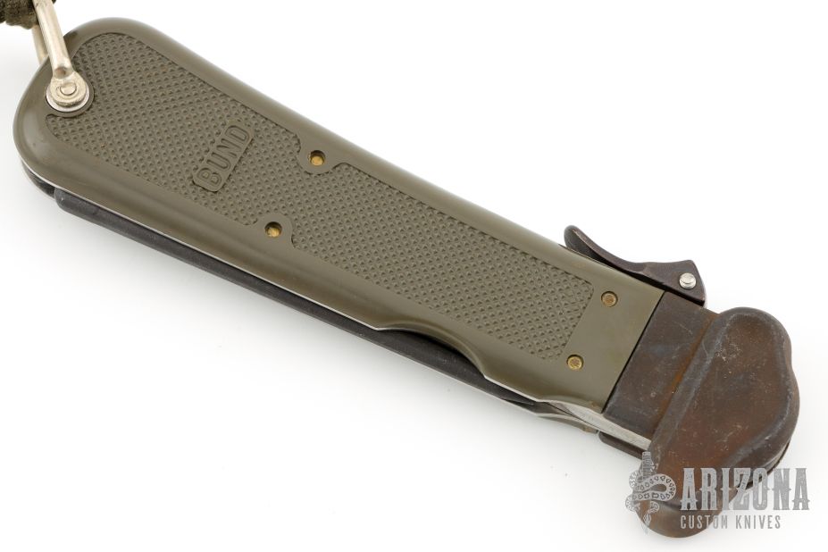 This German Army Paratrooper Knife from Bund features a spear point satin finish gravity blade. The handle is comprised of a steel guard and lever with OD Green plastic scales over metal frame. D Ring lanyard bail and lanyard on pommel. Knife also features a steel C4 punch/Marlin spike that deploys to the rear of the knife. Comes in a box. Has some light scuffs and scratches, excellent condition otherwise. The action is a little sticky on this one.