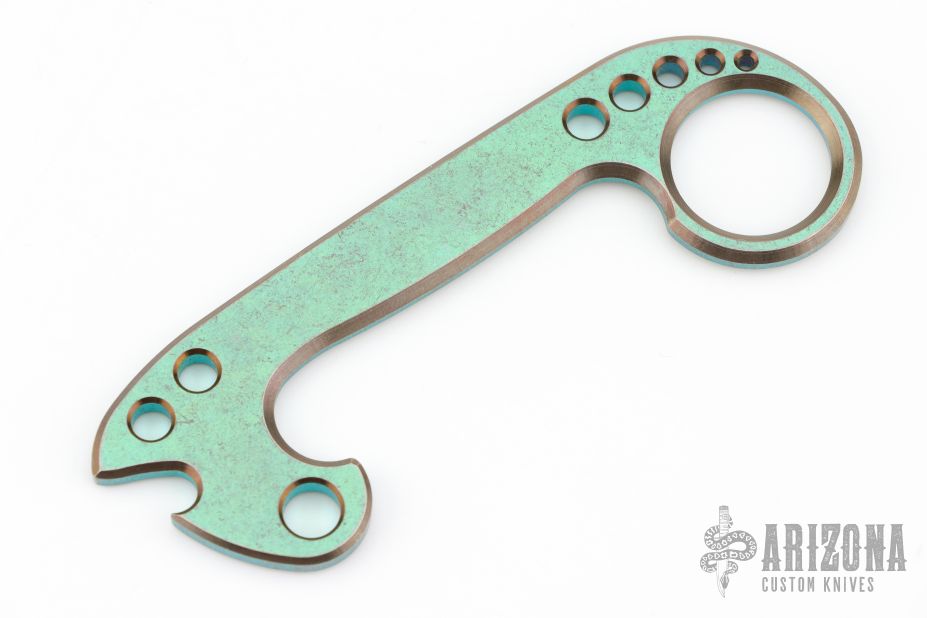 The D.C. Munroe / A. Marfione T-Bot collaboration was designed as a tactical defense implement, it is a bottle opener as well. An effort was made to create a tool that could be legal everywhere and the non-intimidating T-Bot is the result. It features .187" thick titanium with an anodized and stonewash finish. This one has no markings. Excellent condition.