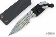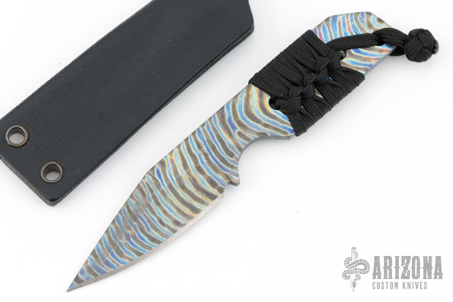 This knife by Strider Knives features a flamed titanium blade with chisel grind but the final edge is ground on both sides, .130" blade stock and .967" blade depth, full tang construction. The handle has cord wrap. Comes with kydex sheath. Excellent condition.
