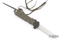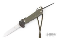 This German Army Paratrooper Knife from Bund features a spear point satin finish gravity blade. The handle is comprised of a steel guard and lever with OD Green plastic scales over metal frame. D Ring lanyard bail and lanyard on pommel. Knife also features a steel C4 punch/Marlin spike that deploys to the rear of the knife. Comes in a box. Has some light scuffs and scratches, excellent condition otherwise. The action on this one is a little sticky.