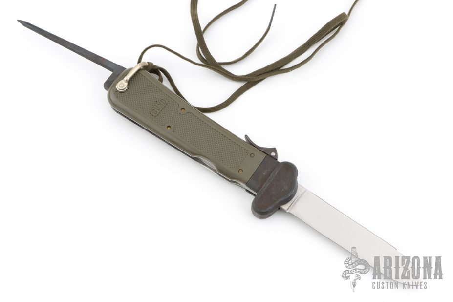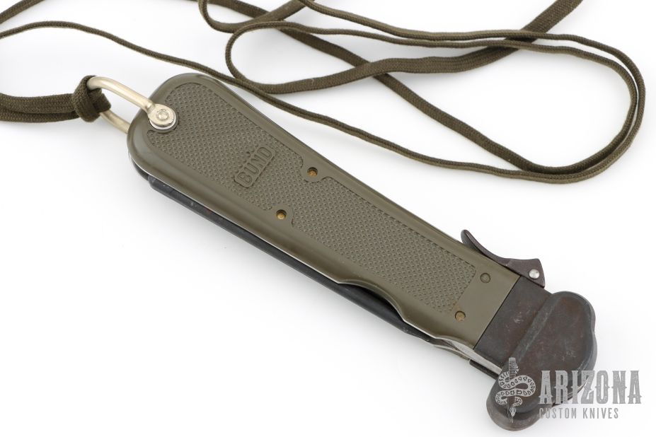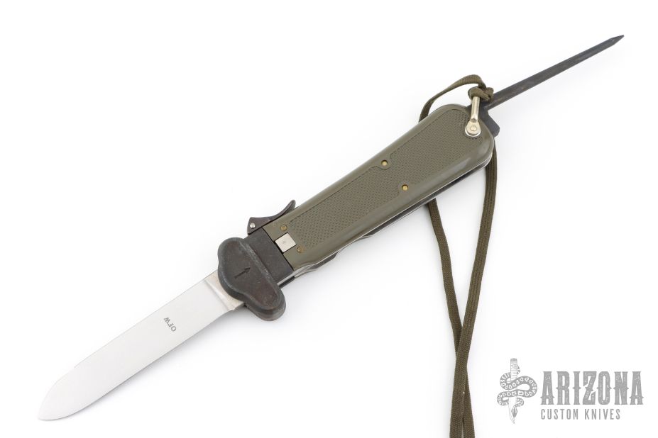 This German Army Paratrooper Knife from Bund features a spear point satin finish gravity blade. The handle is comprised of a steel guard and lever with OD Green plastic scales over metal frame. D Ring lanyard bail and lanyard on pommel. Knife also features a steel C4 punch/Marlin spike that deploys to the rear of the knife. Comes in a box. Has some light scuffs and scratches, excellent condition otherwise. The action on this one is a little sticky.