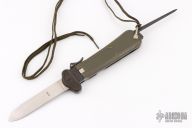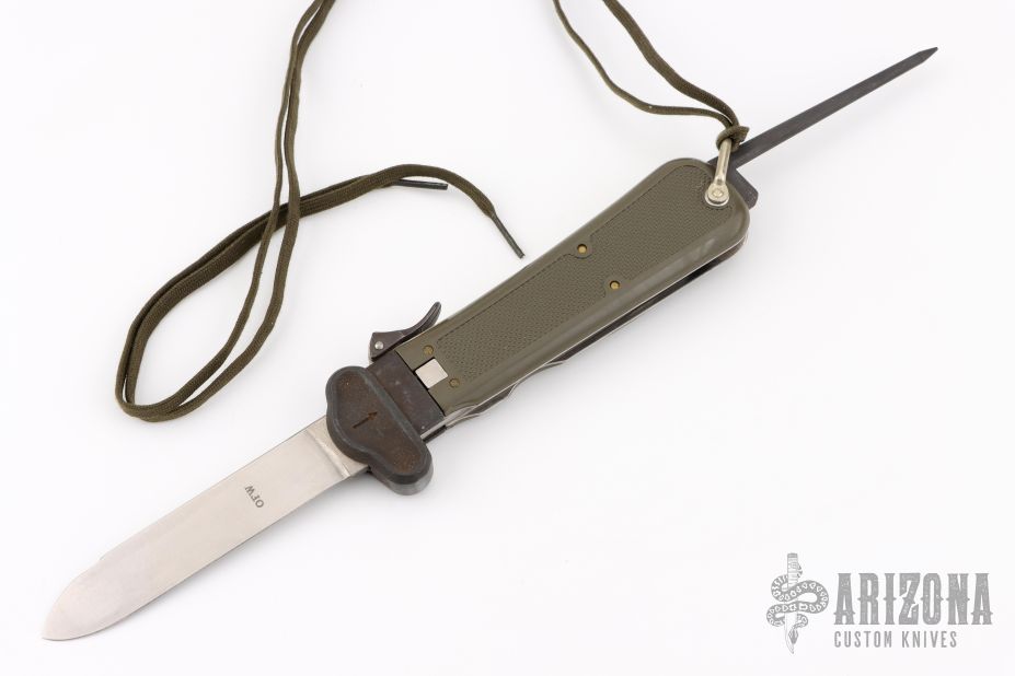 This German Army Paratrooper Knife from Bund features a spear point satin finish gravity blade. The handle is comprised of a steel guard and lever with OD Green plastic scales over metal frame. D Ring lanyard bail and lanyard on pommel. Knife also features a steel C4 punch/Marlin spike that deploys to the rear of the knife. Comes in a box. Has some light scuffs and scratches, excellent condition otherwise. The action on this one is a little sticky.
