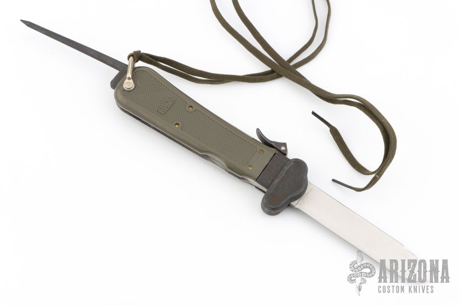 This German Army Paratrooper Knife from Bund features a spear point satin finish gravity blade. The handle is comprised of a steel guard and lever with OD Green plastic scales over metal frame. D Ring lanyard bail and lanyard on pommel. Knife also features a steel C4 punch/Marlin spike that deploys to the rear of the knife. Comes in a box. Has some light scuffs and scratches, excellent condition otherwise. The action on this one is a little sticky.