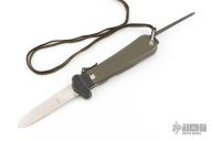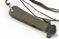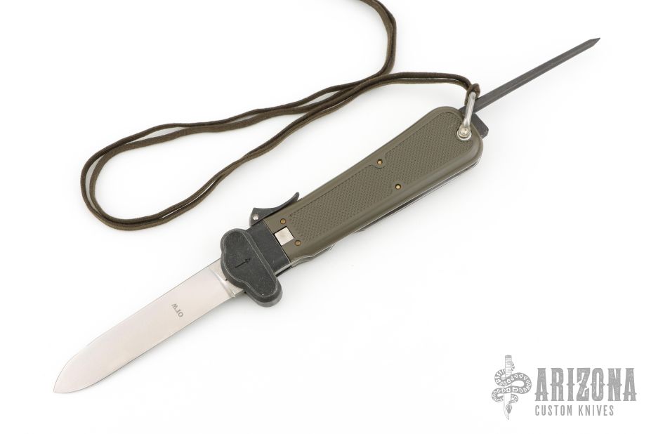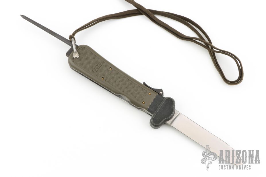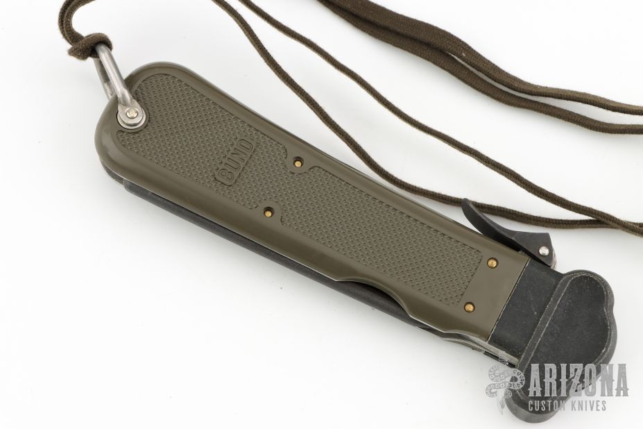 This German Army Paratrooper Knife from Bund features a spear point satin finish gravity blade. The handle is comprised of a steel guard and lever with OD Green plastic scales over metal frame. D Ring lanyard bail and lanyard on pommel. Knife also features a steel C4 punch/Marlin spike that deploys to the rear of the knife. Comes in a box. Has some light scuffs and scratches, excellent condition otherwise. The action on this one is a little sticky.