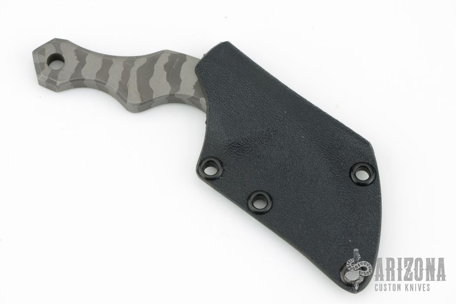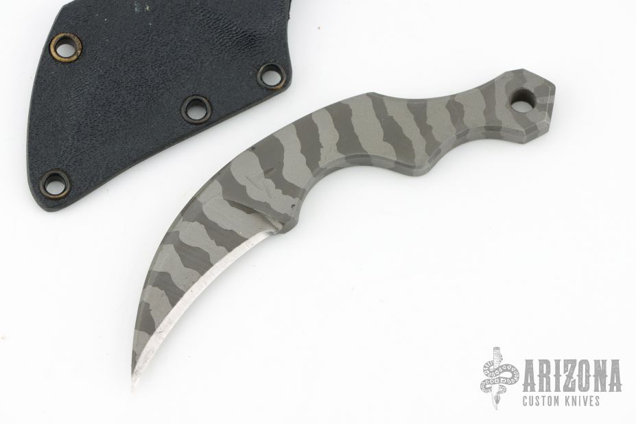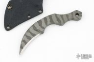 This neck knife by James Coogler features a tiger stripe finished hawkbill blade with .256" thickness and .761" blade depth, full tang construction with lanyard hole. Has some light scuffs, ohteriwse excellent condition. Comes with a kydex neck sheath.