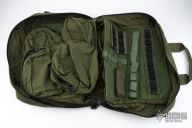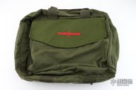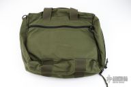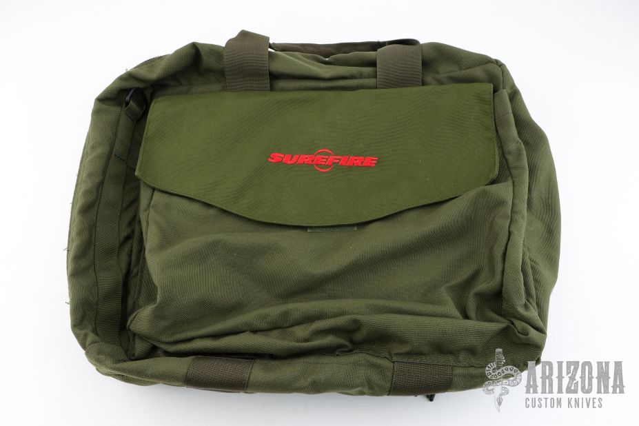 This Gear Bag by SureFire is pretty sweet. It is made of green canvas. It is approximately 18" x 18" x 8". The inside is covered in Velcro, there are four zippered pouches velcro to one side, on the other side is 4 looped gear holders and a velcro knife pouch. Has a zippered back pocket, and a velcro front pocket that has two pockets inside and elastic loops. Excellent condition.