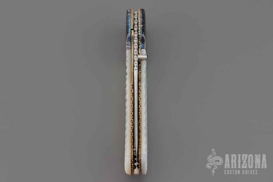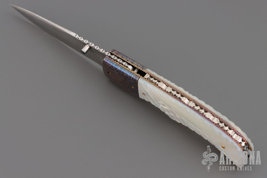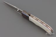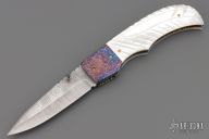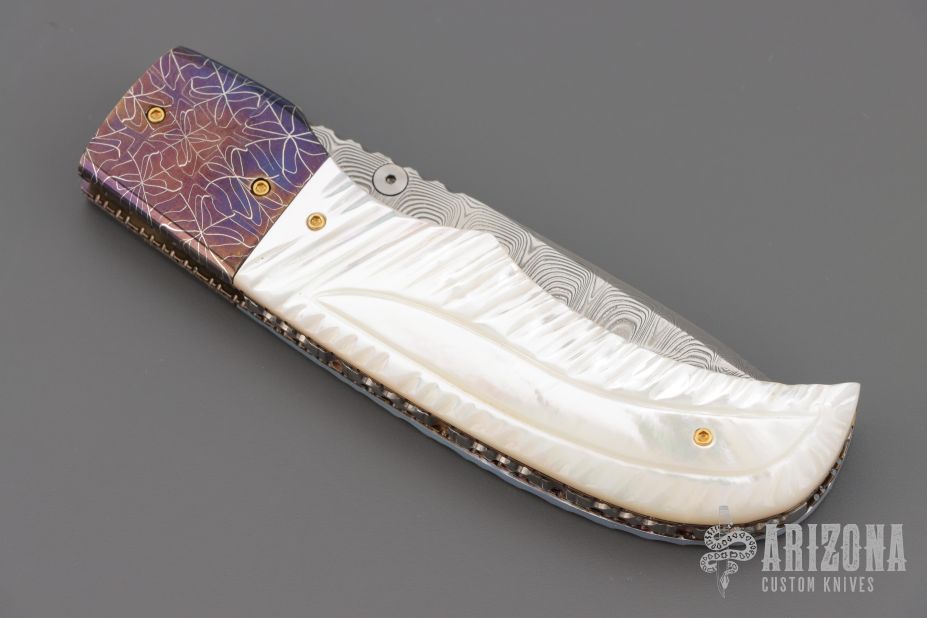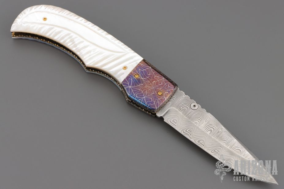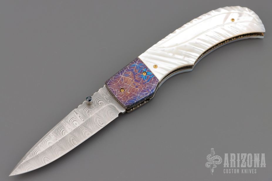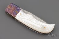 This linerlock folder from Ralph Freer features a spear point Damasteel blade with a false top edge, single thumbstud with 3mm blue sapphire, and file worked thumbrest. The handle has heat colored Eggerling Damascus bolsters, fluted and carved mother of pearl scales, anodized and file worked titanium liners with jeweled interiors, and file worked titanium backstrap. 24k gold plated screws. Nice lockup and blade seating. Excellent condition. Includes maker's card and original purchase receipt.