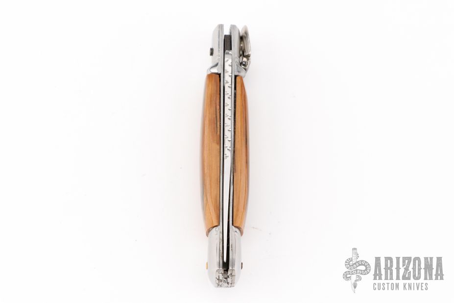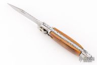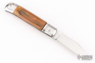 This leverlock auto by Edgeco features a mirror finished blade with fileworked spine. The handle has stainless steel bolsters and butt, mammoth ivory scales, fileworked stainless steel liners and backspacer. Has a few light scratches, otherwise excellent condition.