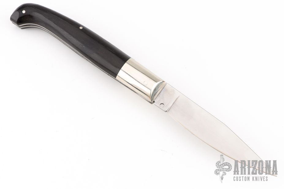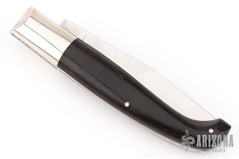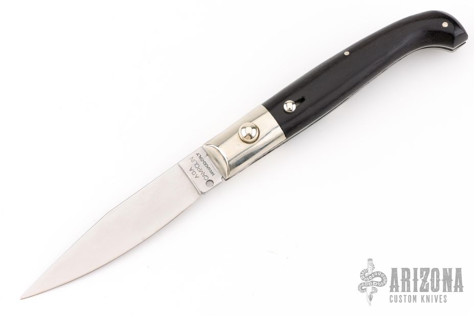 This knife by AGA Campolin features a mirror polished clip point blade. The handle has nickel silver bolsters and button release, dark wood scales, stainless liners, safety and backspacer. Nice action, nice lockup and blade seating. Excellent condition.