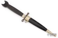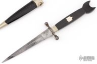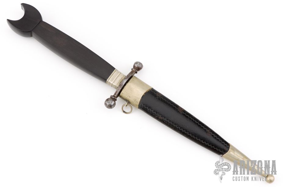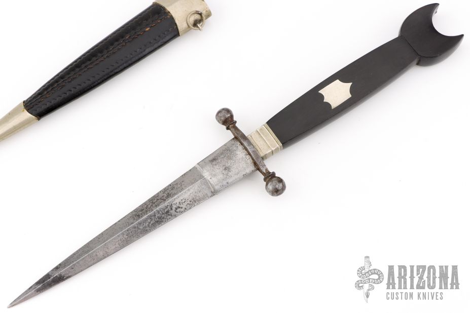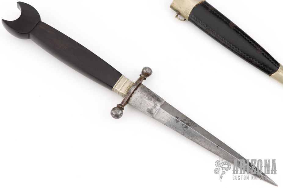This 19th Century French Prostitute Dagger features a spear point blade with unsharpened edges, .250" blade stock and .680" blade depth, hidden tang construction. The has a steel guard, fluted nickel silver collar, carved dark wood grip with a nickel silver escutcheon. Comes with a black leather sheath with nickel silver fittings. The blade has some scratches and patina, the handle has a few light scratches, otherwise excellent condition for its age.
