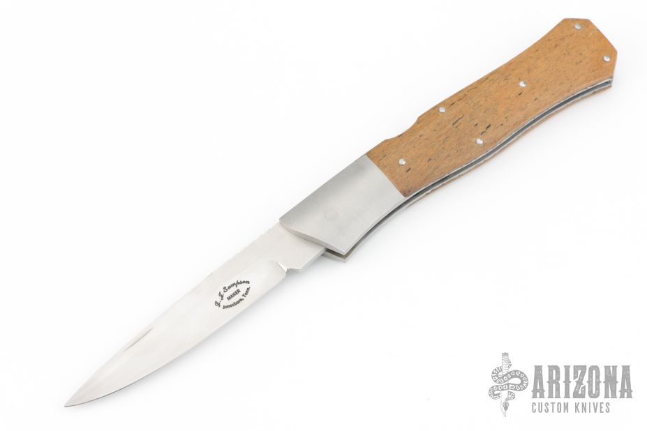 This Lockback by Lynn Sampson features a hand rub satin finished clip point blade with swedge, nail nick and file worked thumb rest. The handle is comprised of steel bolsters with bone covers over file worked liners and rockerbar. Has some light scratches, excellent condition otherwise.