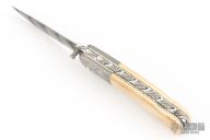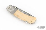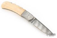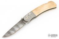 This lockback folder by Ken Pfeiffer features a Damascus spear point blade, damascus bolsters, and mammoth ivory covers. The blade has a gold pinned Damascus single thumb stud. The handle has gold pins, file worked nickel silver liners, pronounced, and file worked rocker bar. Has some light rusting on the bolsters and blade edge. Excellent condition otherwise.