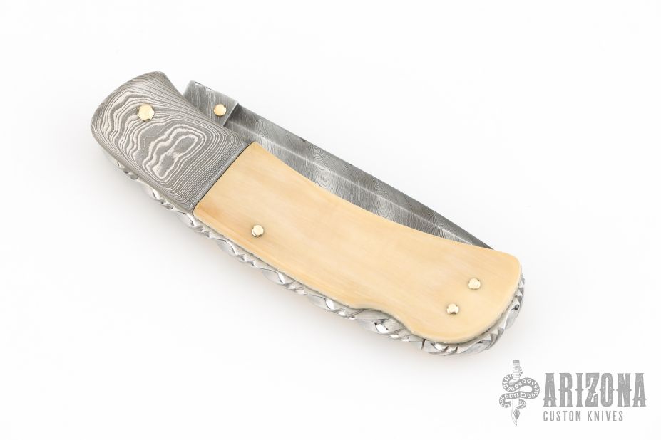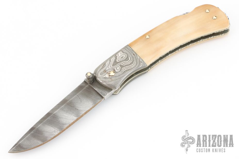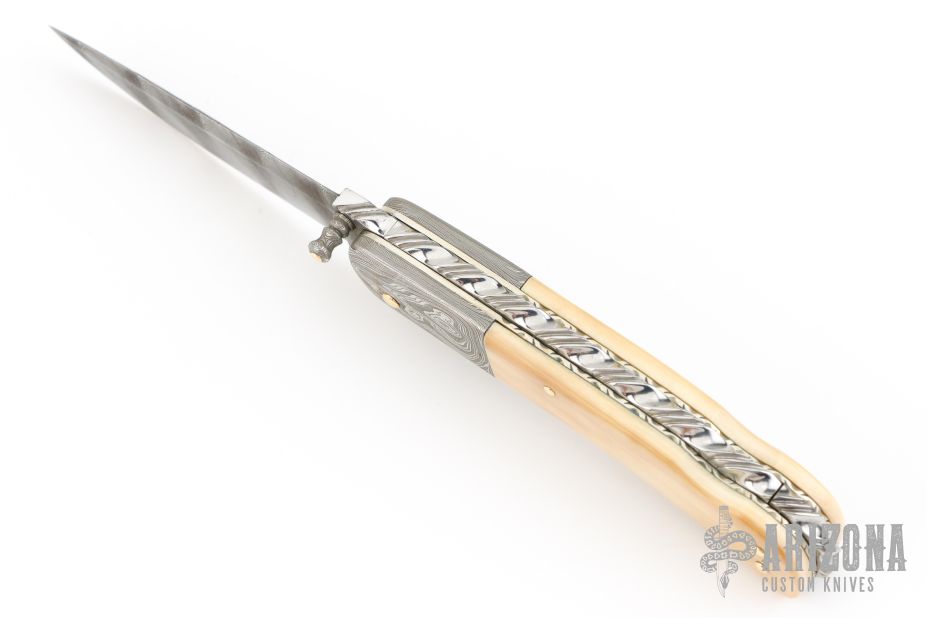 This lockback folder by Ken Pfeiffer features a Damascus spear point blade, damascus bolsters, and mammoth ivory covers. The blade has a gold pinned Damascus single thumb stud. The handle has gold pins, file worked nickel silver liners, pronounced, and file worked rocker bar. Has some light rusting on the bolsters and blade edge. Excellent condition otherwise.