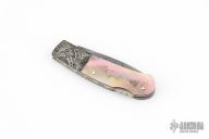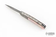 This Lockback by W.D. Pease features a Hank Knickmeyer Damascus blade with a nail nick. The handle is comprised of mosaic Damascus bolsters, stainless liners, file worked stainless rocker bar and micarta back spacer with black lip pearl and 14k gold pins. Excellent condition.