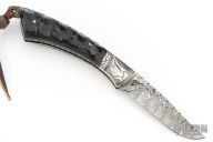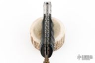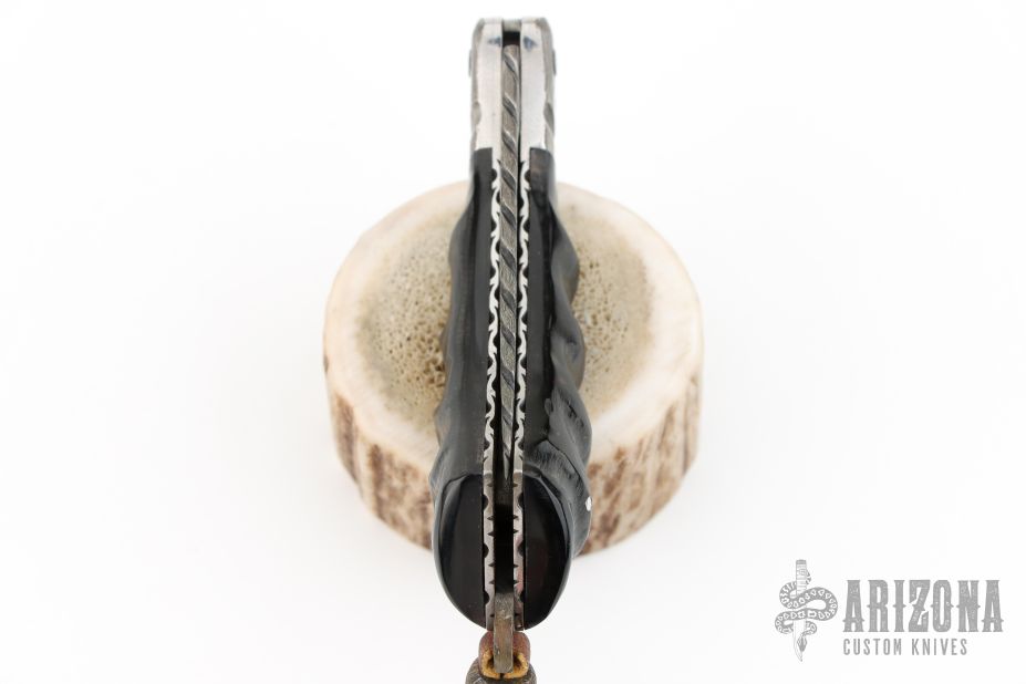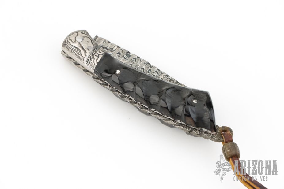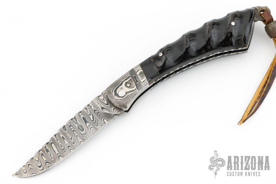 This lockback from Wayne Valachovic features a drop point ladder pattern Damascus blade with fileworked spine. The handle is comprised of fluted Damascus bolsters, Impala horn covers over file worked stainless steel liners and file worked Damascus backspacer. Leather lanyard with Damascus bead on pommel. Comes with original purchase receipt. Has some light rust on the tail and some patina on the blade/bolster. Great condition otherwise.