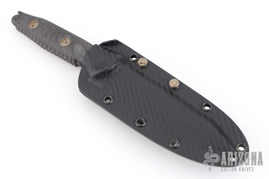 This Socom Alpha by Microtech features a DLC tanto blade with a notched thumb ramp and a full tang construction, .163" Blade Stock. 1.189" Blade Depth. The handle features carbon fiber scales. Includes a kydex sheath with a belt clip. Dated 11/2023.  S/N 643. Excellent Condition. Comes with original box and papers.