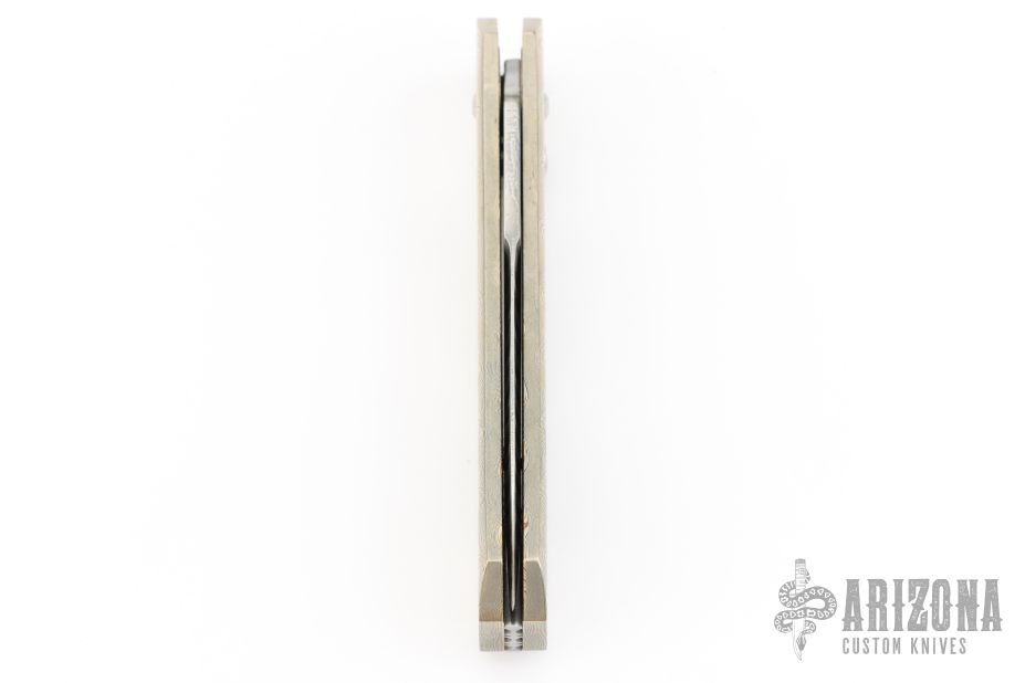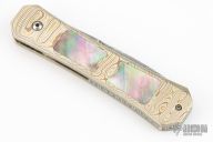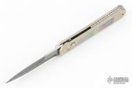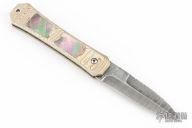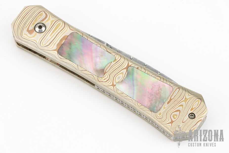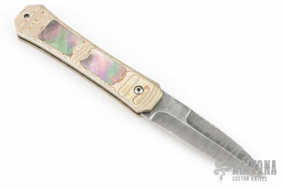 This custom coffin-style interframe automatic by Mel Pardue features a Damascus spear point blade and a mokume frame with black lip pearl inserts on the frame and push button. False top edge. Has some light scuffs and patina. Excellent condition otherwise.