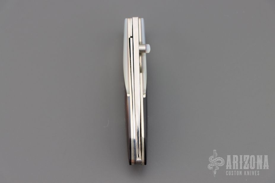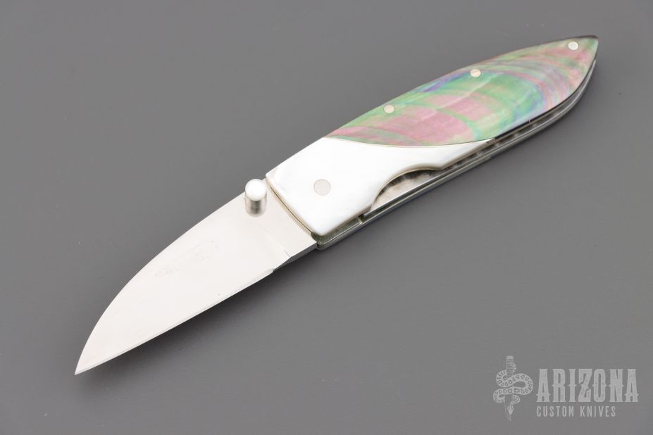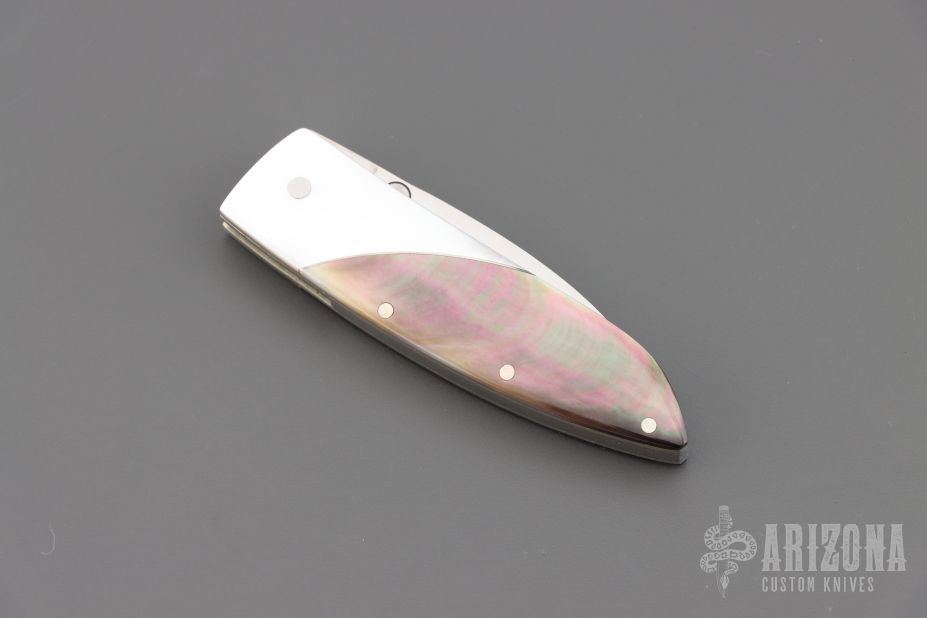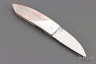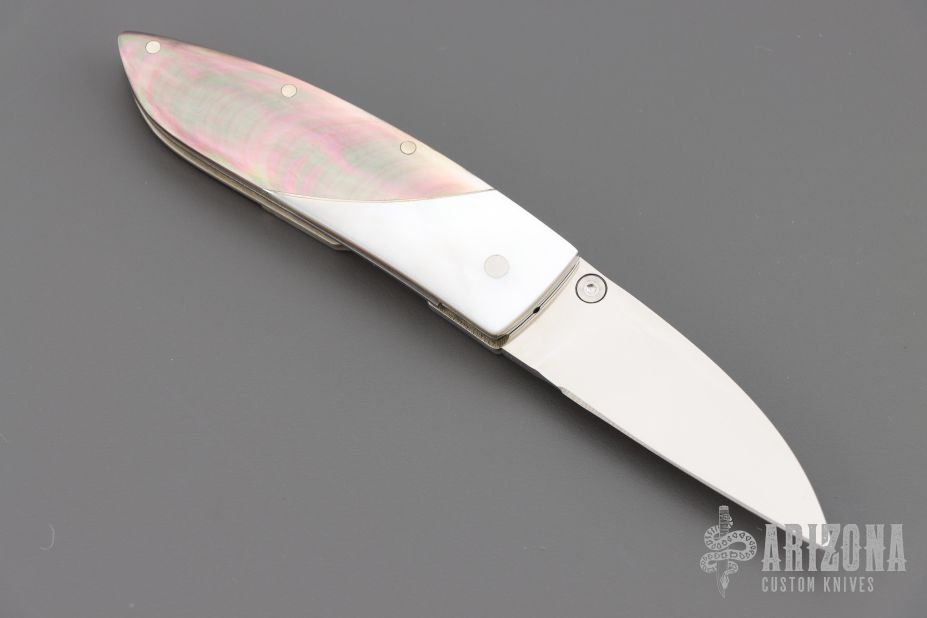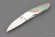 This linerlock folder from Koji Hara features a mirror polished drop point blade with mother of pearl thumbstud. The handle has with mother of pearl bolsters, black lip pearl covers, nickel silver liners, and spacers with stainless liner and backstrap. Nice detent, lockup and blade seating. Excellent condition. Comes in a Bill's case.