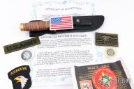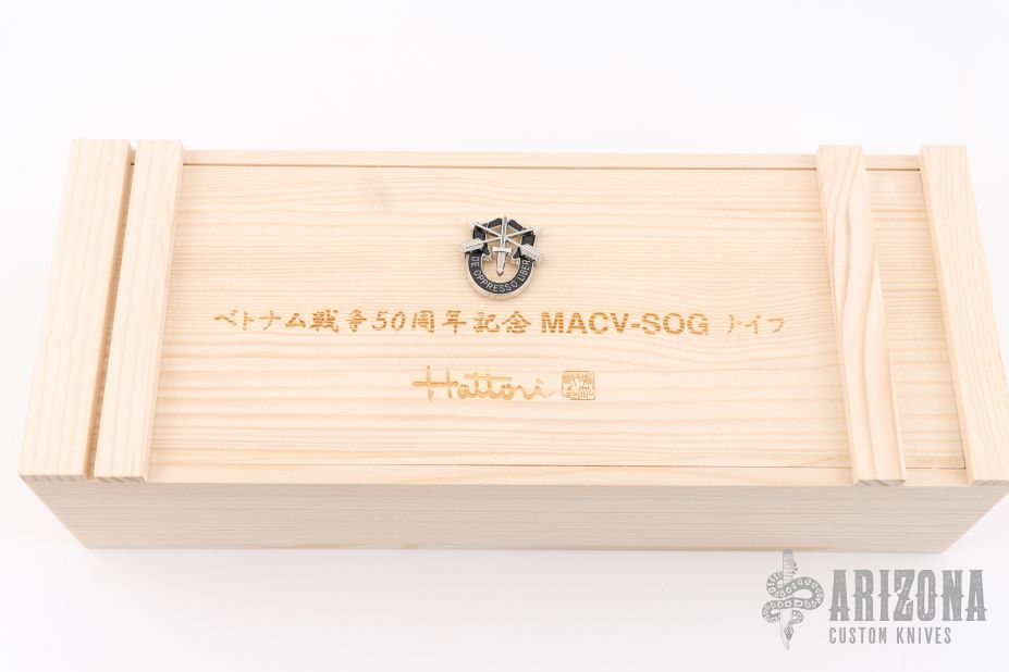 The knife comes with Black leather sheath with sharpening stone pocket, and Presentation Wooden Box with "De Oppresso Liber" SF emblem attached on the lid. You will also find Special Forces coin, MACV-SOG sticker and U.S. Army patches included in the box. The first Serial #01-10 also includes United State Army coin and more patches. Please enjoy the historical treasure knife in a decorative display wooden box with "Certificate of Authenticity" signed by Ichiro Hattori, and "History of Hattori & MACV-SOG Knife" Your choice of the serial numbers 01/50 - 50/50, and the price varies by serial number.