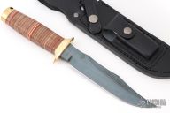 Master Hattori has reproduced 50 special limited Anniversary knives, and just came up in right time of the 50th Anniversary year and month. It features original 6-1/4" Hollow ground Gunblued SK-5 carbon steel Bowie blade etched with "Vietnam War 50th Anniversary 1955-1975" and "50 Limited Edition of MACV-SOG Knife" on blade, and "De Oppresso" Special Forces Crest on tang. Each serial number is engraved on the bolster. The stacked Leather handle has Red Fiber & Gold Brass spacers (Vietnam flag colors) and solid Brass bolster & butt end.