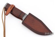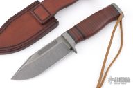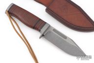 This Micro Tank by Petr Weingartner features a clip point stonewash finished blade with fullers and notched thumbrest, .201" blade stock and 1.508" blade depth, hidden tang construction. The handle has a bead blasted stainless steel guard and butt, stacked leather handle with black spacers. Lanyard hole in pommel. Includes leather sheath with belt loop. New condition. Comes with COA dated 3-3-25
