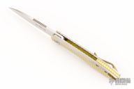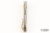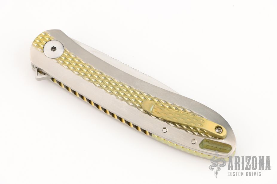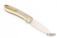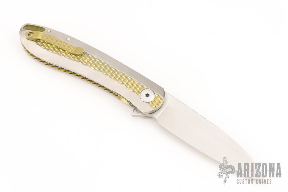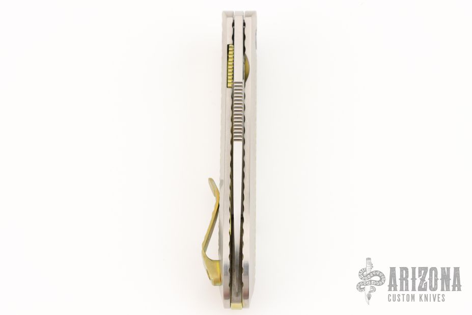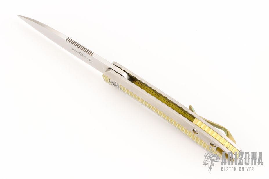 The Slacker, a liner locking flipper. Ken calls this his fully customized mid-tech as he has some parts cut but he hand fits and finishes everything himself. This knife features a hand rubbed satin finished blade of CPM 154 steel, a Titanium frame with checkering to improve grip, the checkering is also on the pocket clip, the checkered areas are anodized as is the liner lock and the decorated back spacer, inside the frame it is scalloped, there is an integral lanyard hole and the titanium pivot collar is decorated with the Onion trademark.  Excellent Condition.