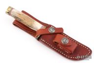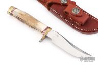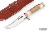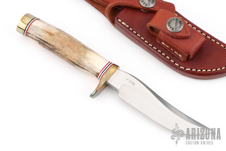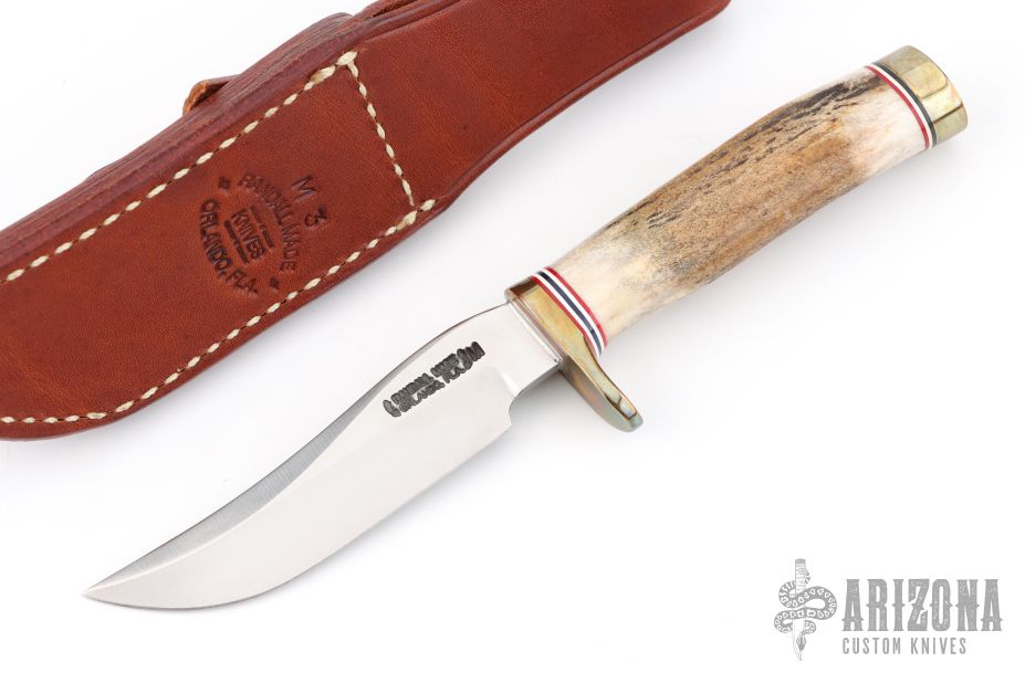 This Miniature Model 3 Hunter by Randall features a stainless steel blade with false top edge, .165" blade stock and .820" blade depth, hidden tang construction. The handle has a brass guard and butt, and stag grip with red/white/blue spacers. This knife is part of a limited edition and is numbered 1276. Comes with a brown leather sheath. Excellent condition.