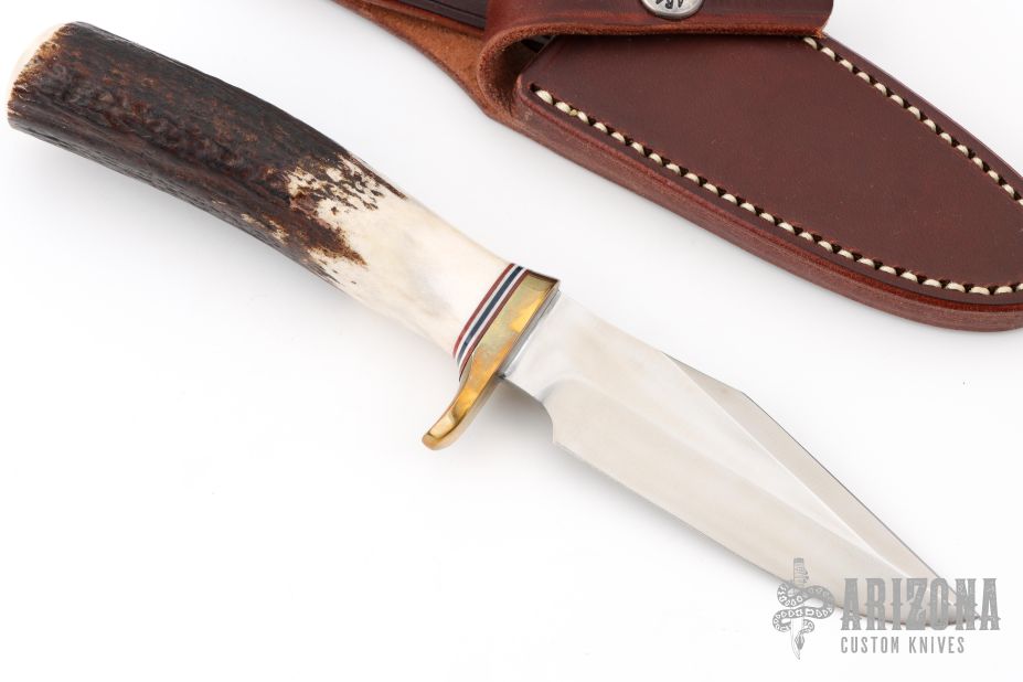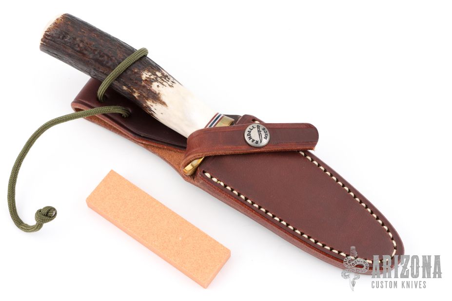 This Model 8-4 by Randall Made Knives features a satin finished blade with sharpened top edge, .170" blade thickness, 1.102" blade depth, hidden tang construction. Especially suitable for small fish and feathered game. Brass guard and stag grip with red/white/blue spacers. Comes with a brown leather sheath and original paper wrapping. Excellent condition.