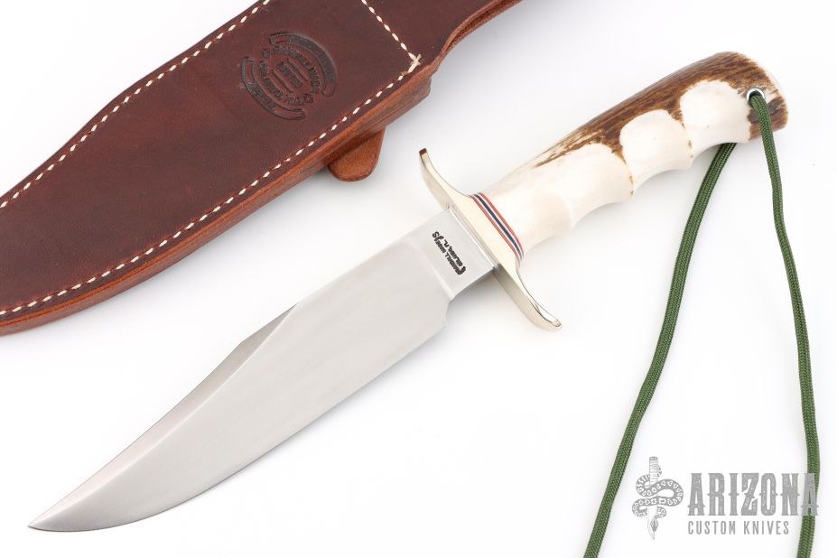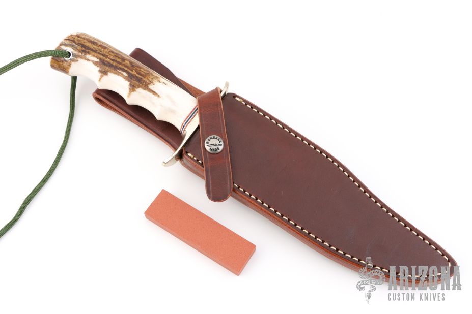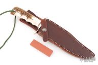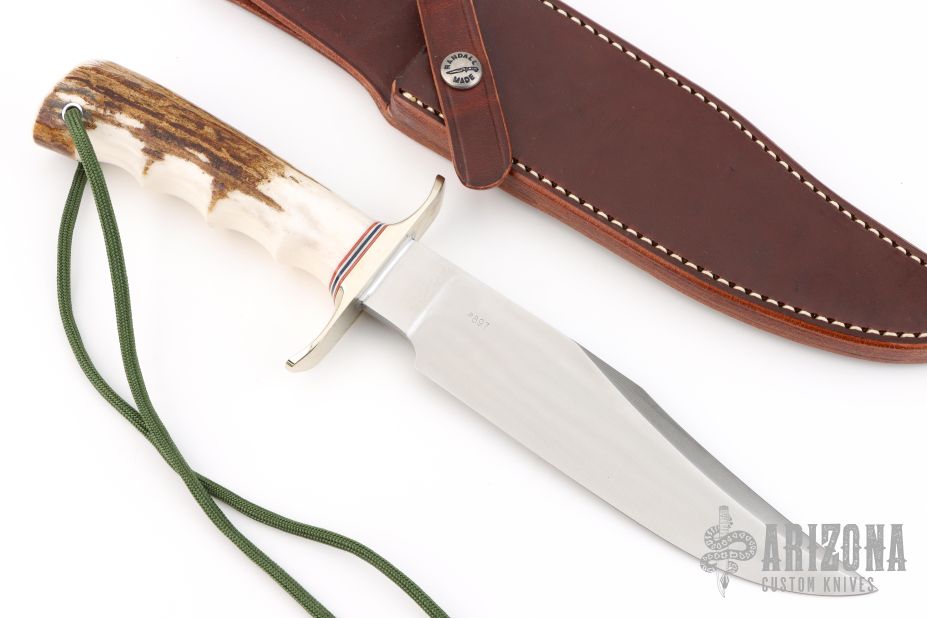 This "Nordic Knives Special Bowie" was made by Randall and originally sold by Nordic Knives. It has a satin finished blade with .238" blade thickness and 1.402" blade depth, sharpened top edge, hidden tang construction. The handle has a nickel silver guard, finger groove stag grip with red/white/blue spacers. #897 on back side of blade. Comes with a brown leather sheath and original paper wrapping. Excellent condition.